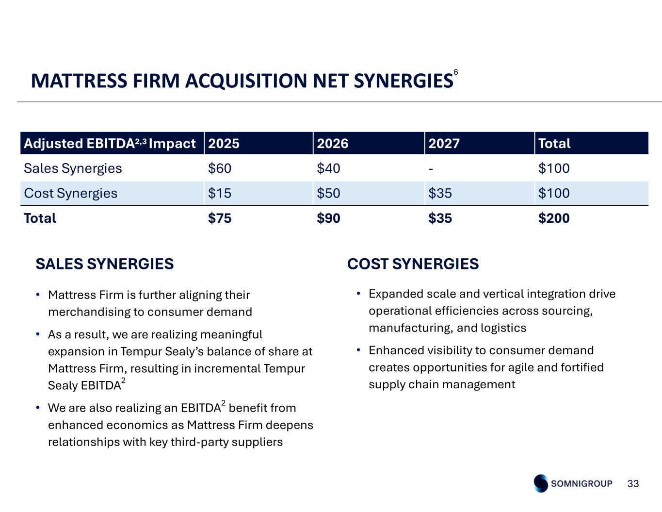 32 Accounting for Mattress Firm acquisition ACQUISITION AND DIVESTITURE • The acquisition of Mattress Firm on February 5th • The divestiture of 103 Sleep Outfitters and 73 Mattress Firm stores on May 1st • The elimination of intercompany sales between Mattress Firm and Tempur Sealy, which is expected to be approximately 19% of global Tempur Sealy sales in 2025 • Tempur Sealy has historically accounted for store occupancy costs in operating expense. It is now treated as COGS. This will result in an approximate 150 basis point headwind to North America’s gross margin and an 800 basis point headwind to International’s gross margin year over year • Mattress Firm has historically accounted for co-operative advertising dollars provided by Tempur Sealy as a reduction to COGS. It is now treated as a reduction to advertising expense. Tempur Sealy continues to account for all co-operative advertising investments in Advertising expense P&L LANDSCAPING PURCHASE PRICE ACCOUNTING • Approximately $15 million of incremental non-cash expense associated with the step up to fair value of the acquired Mattress Firm business, which will primarily impact Mattress Firm COGS 2025 OUTLOOK6