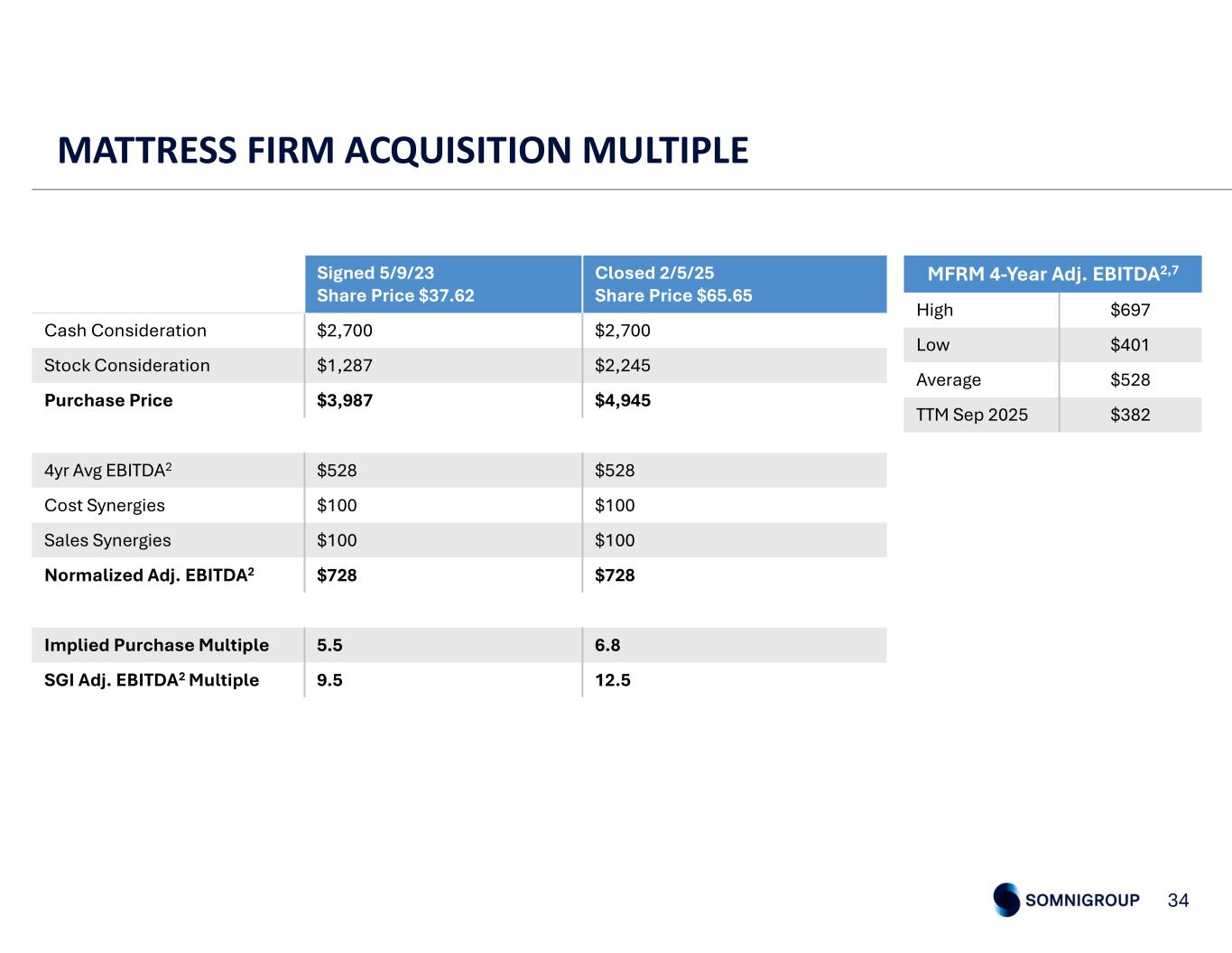 Total202720262025Adjusted EBITDA2,3 Impact $100-$40$60Sales Synergies $100$35$50$15Cost Synergies $200$35$90$75Total MATTRESS FIRM ACQUISITION NET SYNERGIES6 • Expanded scale and vertical integration drive operational efficiencies across sourcing, manufacturing, and logistics • Enhanced visibility to consumer demand creates opportunities for agile and fortified supply chain management COST SYNERGIESSALES SYNERGIES • Mattress Firm is further aligning their merchandising to consumer demand • As a result, we are realizing meaningful expansion in Tempur Sealy’s balance of share at Mattress Firm, resulting in incremental Tempur Sealy EBITDA2 • We are also realizing an EBITDA2 benefit from enhanced economics as Mattress Firm deepens relationships with key third-party suppliers 33