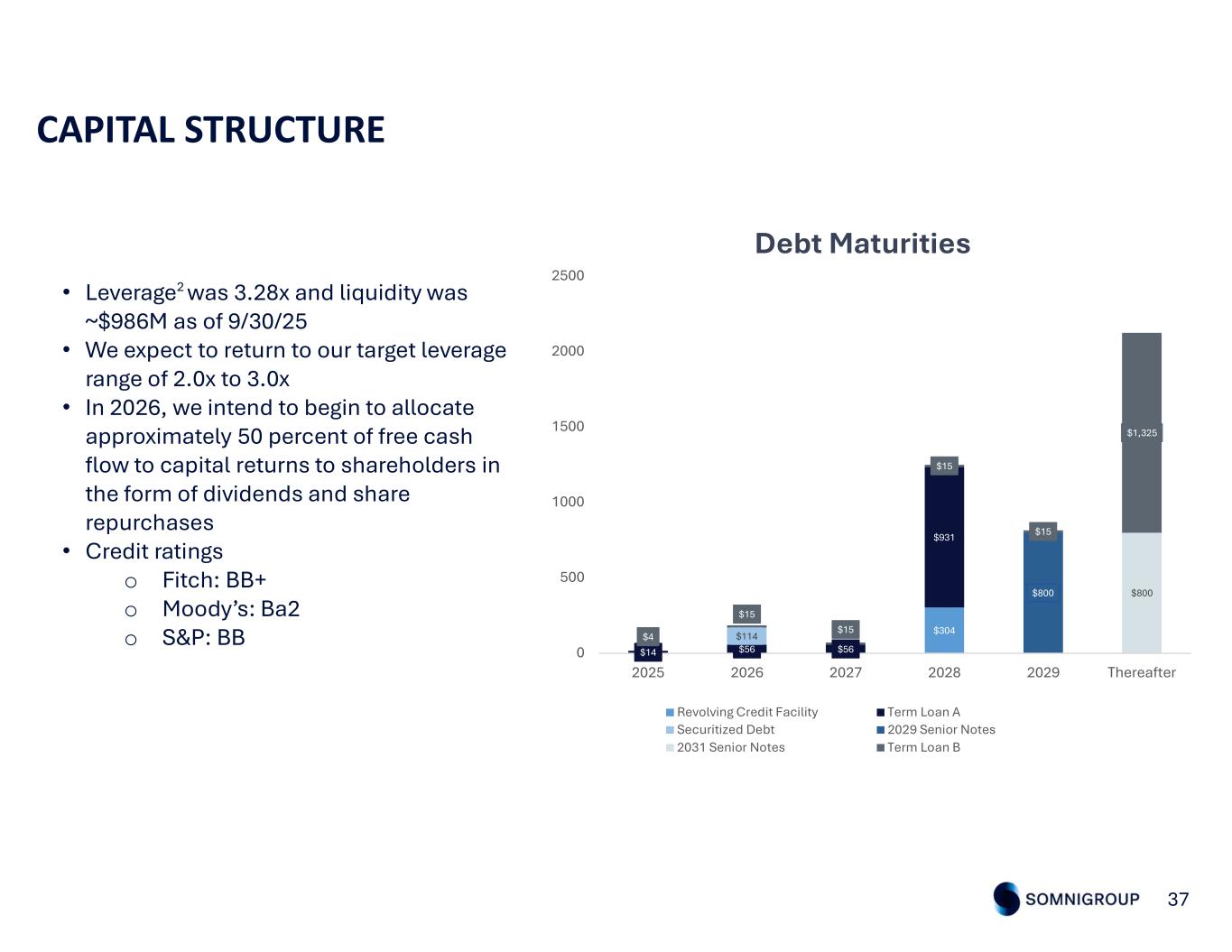 CAPITAL STRUCTURE 37 • Leverage2 was 3.28x and liquidity was ~$986M as of 9/30/25 • We expect to return to our target leverage range of 2.0x to 3.0x • In 2026, we intend to begin to allocate approximately 50 percent of free cash flow to capital returns to shareholders in the form of dividends and share repurchases • Credit ratings o Fitch: BB+ o Moody’s: Ba2 o S&P: BB $304 $14 $56 $56 $931 $114 $800 $800 $4 $15 $15 $15 $15 $1,325 0 500 1000 1500 2000 2500 2025 2026 2027 2028 2029 Thereafter Debt Maturities Revolving Credit Facility Term Loan A Securitized Debt 2029 Senior Notes 2031 Senior Notes Term Loan B