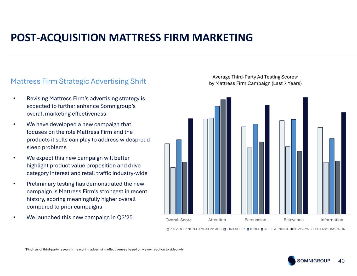 POST-ACQUISITION MATTRESS FIRM MARKETING 40 Mattress Firm Strategic Advertising Shift • Revising Mattress Firm’s advertising strategy is expected to further enhance Somnigroup’s overall marketing effectiveness • We have developed a new campaign that focuses on the role Mattress Firm and the products it sells can play to address widespread sleep problems • We expect this new campaign will better highlight product value proposition and drive category interest and retail traffic industry-wide • Preliminary testing has demonstrated the new campaign is Mattress Firm’s strongest in recent history, scoring meaningfully higher overall compared to prior campaigns • We launched this new campaign in Q3’25 *Findings of third-party research measuring advertising effectiveness based on viewer reaction to video ads. Overall Ace Score Attention Persuasion Relevance Information Average Third-Party Ad Testing Scores* by Mattress Firm Campaign (Last 7 Years) PREVIOUS "NON-CAMPAIGN" ADS JUNK SLEEP TRMM SLEEP AT NIGHT NEW 2025 SLEEP EASY CAMPAIGN Overall Score
