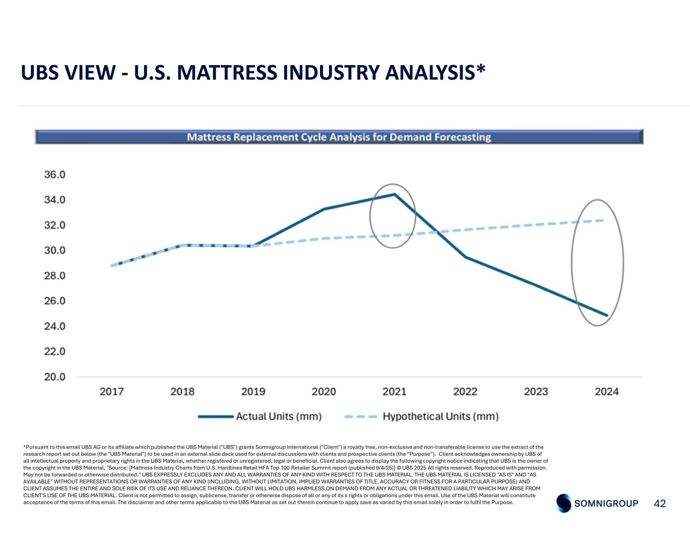 UBS VIEW - U.S. MATTRESS INDUSTRY ANALYSIS* 42Source: ISPA, U.S. ITC, management estimates *Pursuant to this email UBS AG or its affiliate which published the UBS Material ("UBS") grants Somnigroup International ("Client") a royalty free, non-exclusive and non-transferable license to use the extract of the research report set out below (the "UBS Material") to be used in an external slide deck used for external discussions with clients and prospective clients (the “Purpose”). Client acknowledges ownership by UBS of all intellectual property and proprietary rights in the UBS Material, whether registered or unregistered, legal or beneficial. Client also agrees to display the following copyright notice indicating that UBS is the owner of the copyright in the UBS Material, "Source: [Mattress Industry Charts from U.S. Hardlines Retail HFA Top 100 Retailer Summit report (published 9/4/25)] © UBS 2025 All rights reserved. Reproduced with permission. May not be forwarded or otherwise distributed." UBS EXPRESSLY EXCLUDES ANY AND ALL WARRANTIES OF ANY KIND WITH RESPECT TO THE UBS MATERIAL. THE UBS MATERIAL IS LICENSED "AS IS" AND "AS AVAILABLE" WITHOUT REPRESENTATIONS OR WARRANTIES OF ANY KIND (INCLUDING, WITHOUT LIMITATION, IMPLIED WARRANTIES OF TITLE, ACCURACY OR FITNESS FOR A PARTICULAR PURPOSE) AND CLIENT ASSUMES THE ENTIRE AND SOLE RISK OF ITS USE AND RELIANCE THEREON. CLIENT WILL HOLD UBS HARMLESS ON DEMAND FROM ANY ACTUAL OR THREATENED LIABILITY WHICH MAY ARISE FROM CLIENT'S USE OF THE UBS MATERIAL. Client is not permitted to assign, sublicense, transfer or otherwise dispose of all or any of its s rights or obligations under this email. Use of the UBS Material will constitute acceptance of the terms of this email. The disclaimer and other terms applicable to the UBS Material as set out therein continue to apply save as varied by this email solely in order to fulfil the Purpose.