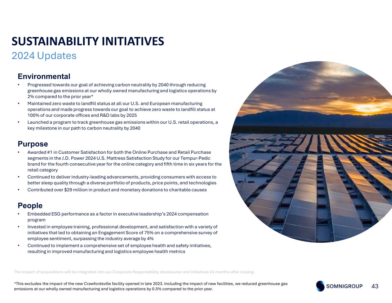 43 SUSTAINABILITY INITIATIVES Environmental • Progressed towards our goal of achieving carbon neutrality by 2040 through reducing greenhouse gas emissions at our wholly owned manufacturing and logistics operations by 2% compared to the prior year* • Maintained zero waste to landfill status at all our U.S. and European manufacturing operations and made progress towards our goal to achieve zero waste to landfill status at 100% of our corporate offices and R&D labs by 2025 • Launched a program to track greenhouse gas emissions within our U.S. retail operations, a key milestone in our path to carbon neutrality by 2040 Purpose • Awarded #1 in Customer Satisfaction for both the Online Purchase and Retail Purchase segments in the J.D. Power 2024 U.S. Mattress Satisfaction Study for our Tempur-Pedic brand for the fourth consecutive year for the online category and fifth time in six years for the retail category • Continued to deliver industry-leading advancements, providing consumers with access to better sleep quality through a diverse portfolio of products, price points, and technologies • Contributed over $29 million in product and monetary donations to charitable causes People • Embedded ESG performance as a factor in executive leadership’s 2024 compensation program • Invested in employee training, professional development, and satisfaction with a variety of initiatives that led to obtaining an Engagement Score of 75% on a comprehensive survey of employee sentiment, surpassing the industry average by 4% • Continued to implement a comprehensive set of employee health and safety initiatives, resulting in improved manufacturing and logistics employee health metrics *This excludes the impact of the new Crawfordsville facility opened in late 2023. Including the impact of new facilities, we reduced greenhouse gas emissions at our wholly owned manufacturing and logistics operations by 0.5% compared to the prior year. The impact of acquisitions will be integrated into our Corporate Responsibility disclosures and initiatives 24 months after closing. 2024 Updates