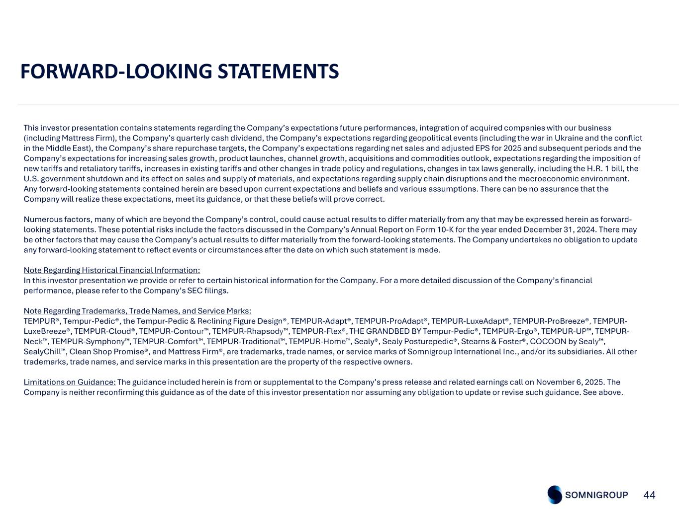 44 This investor presentation contains statements regarding the Company’s expectations future performances, integration of acquired companies with our business (including Mattress Firm), the Company’s quarterly cash dividend, the Company’s expectations regarding geopolitical events (including the war in Ukraine and the conflict in the Middle East), the Company’s share repurchase targets, the Company’s expectations regarding net sales and adjusted EPS for 2025 and subsequent periods and the Company’s expectations for increasing sales growth, product launches, channel growth, acquisitions and commodities outlook, expectations regarding the imposition of new tariffs and retaliatory tariffs, increases in existing tariffs and other changes in trade policy and regulations, changes in tax laws generally, including the H.R. 1 bill, the U.S. government shutdown and its effect on sales and supply of materials, and expectations regarding supply chain disruptions and the macroeconomic environment. Any forward-looking statements contained herein are based upon current expectations and beliefs and various assumptions. There can be no assurance that the Company will realize these expectations, meet its guidance, or that these beliefs will prove correct. Numerous factors, many of which are beyond the Company’s control, could cause actual results to differ materially from any that may be expressed herein as forward- looking statements. These potential risks include the factors discussed in the Company’s Annual Report on Form 10-K for the year ended December 31, 2024. There may be other factors that may cause the Company’s actual results to differ materially from the forward-looking statements. The Company undertakes no obligation to update any forward-looking statement to reflect events or circumstances after the date on which such statement is made. Note Regarding Historical Financial Information: In this investor presentation we provide or refer to certain historical information for the Company. For a more detailed discussion of the Company’s financial performance, please refer to the Company’s SEC filings. Note Regarding Trademarks, Trade Names, and Service Marks: TEMPUR®, Tempur-Pedic®, the Tempur-Pedic & Reclining Figure Design®, TEMPUR-Adapt®, TEMPUR-ProAdapt®, TEMPUR-LuxeAdapt®, TEMPUR-ProBreeze®, TEMPUR- LuxeBreeze®, TEMPUR-Cloud®, TEMPUR-Contour , TEMPUR-Rhapsody , TEMPUR-Flex®, THE GRANDBED BY Tempur-Pedic®, TEMPUR-Ergo®, TEMPUR-UP , TEMPUR- Neck , TEMPUR-Symphony , TEMPUR-Comfort , TEMPUR-Traditional , TEMPUR-Home , Sealy®, Sealy Posturepedic®, Stearns & Foster®, COCOON by Sealy , SealyChill , Clean Shop Promise®, and Mattress Firm®, are trademarks, trade names, or service marks of Somnigroup International Inc., and/or its subsidiaries. All other trademarks, trade names, and service marks in this presentation are the property of the respective owners. Limitations on Guidance: The guidance included herein is from or supplemental to the Company’s press release and related earnings call on November 6, 2025. The Company is neither reconfirming this guidance as of the date of this investor presentation nor assuming any obligation to update or revise such guidance. See above. FORWARD-LOOKING STATEMENTS