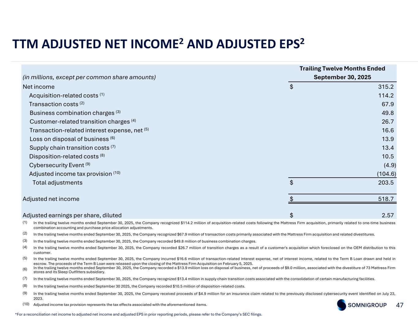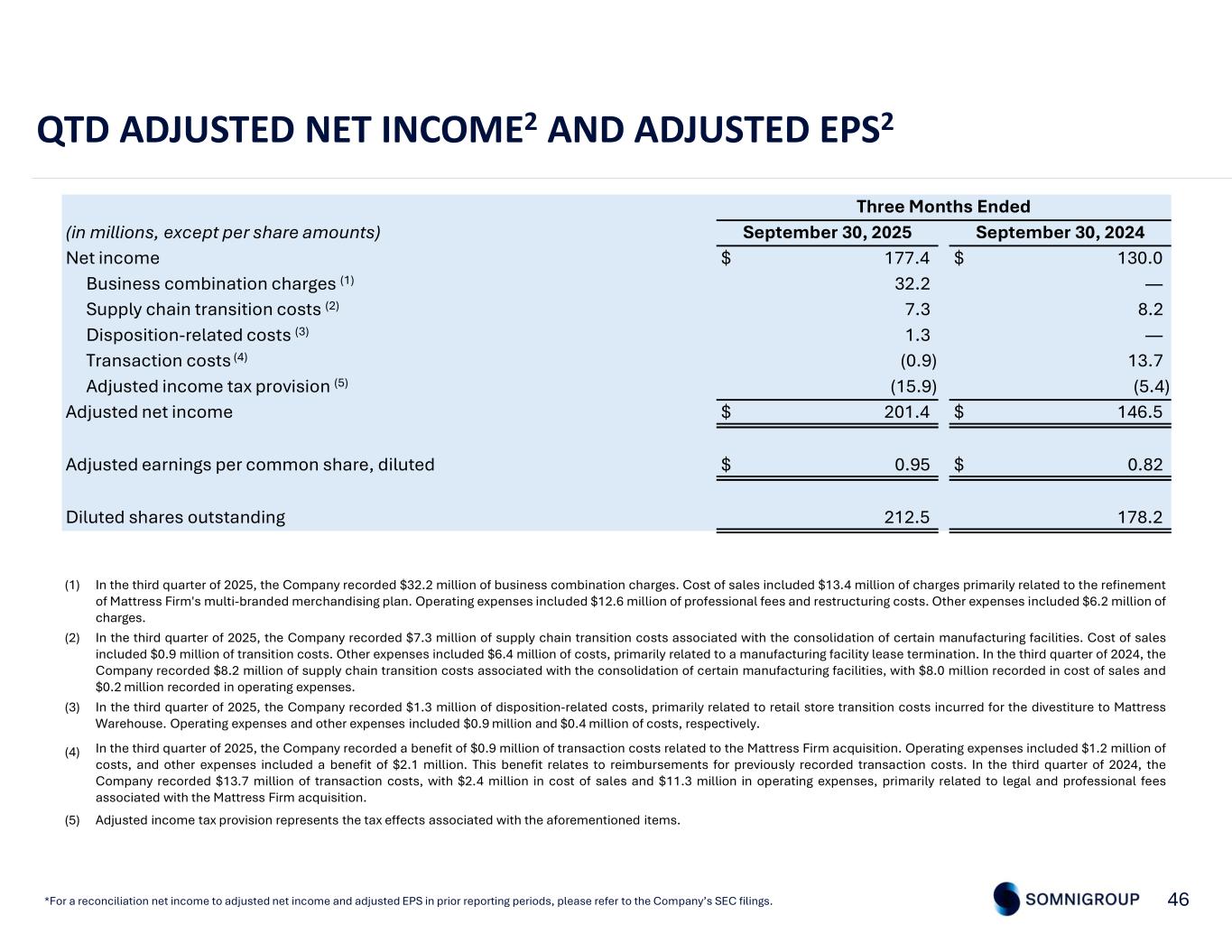 Three Months Ended September 30, 2024September 30, 2025(in millions, except per share amounts) $ 130.0$ 177.4Net income —32.2Business combination charges (1) 8.27.3Supply chain transition costs (2) —1.3Disposition-related costs (3) 13.7(0.9)Transaction costs (4) (5.4)(15.9)Adjusted income tax provision (5) $ 146.5$ 201.4Adjusted net income $ 0.82$ 0.95Adjusted earnings per common share, diluted 178.2212.5Diluted shares outstanding 46 QTD ADJUSTED NET INCOME2 AND ADJUSTED EPS2 *For a reconciliation net income to adjusted net income and adjusted EPS in prior reporting periods, please refer to the Company’s SEC filings. In the third quarter of 2025, the Company recorded $32.2 million of business combination charges. Cost of sales included $13.4 million of charges primarily related to the refinement of Mattress Firm's multi-branded merchandising plan. Operating expenses included $12.6 million of professional fees and restructuring costs. Other expenses included $6.2 million of charges. (1) In the third quarter of 2025, the Company recorded $7.3 million of supply chain transition costs associated with the consolidation of certain manufacturing facilities. Cost of sales included $0.9 million of transition costs. Other expenses included $6.4 million of costs, primarily related to a manufacturing facility lease termination. In the third quarter of 2024, the Company recorded $8.2 million of supply chain transition costs associated with the consolidation of certain manufacturing facilities, with $8.0 million recorded in cost of sales and $0.2 million recorded in operating expenses. (2) In the third quarter of 2025, the Company recorded $1.3 million of disposition-related costs, primarily related to retail store transition costs incurred for the divestiture to Mattress Warehouse. Operating expenses and other expenses included $0.9 million and $0.4 million of costs, respectively. (3) In the third quarter of 2025, the Company recorded a benefit of $0.9 million of transaction costs related to the Mattress Firm acquisition. Operating expenses included $1.2 million of costs, and other expenses included a benefit of $2.1 million. This benefit relates to reimbursements for previously recorded transaction costs. In the third quarter of 2024, the Company recorded $13.7 million of transaction costs, with $2.4 million in cost of sales and $11.3 million in operating expenses, primarily related to legal and professional fees associated with the Mattress Firm acquisition. (4) Adjusted income tax provision represents the tax effects associated with the aforementioned items.(5)