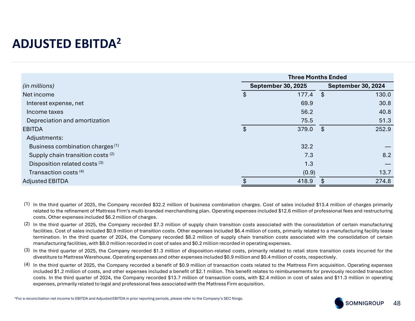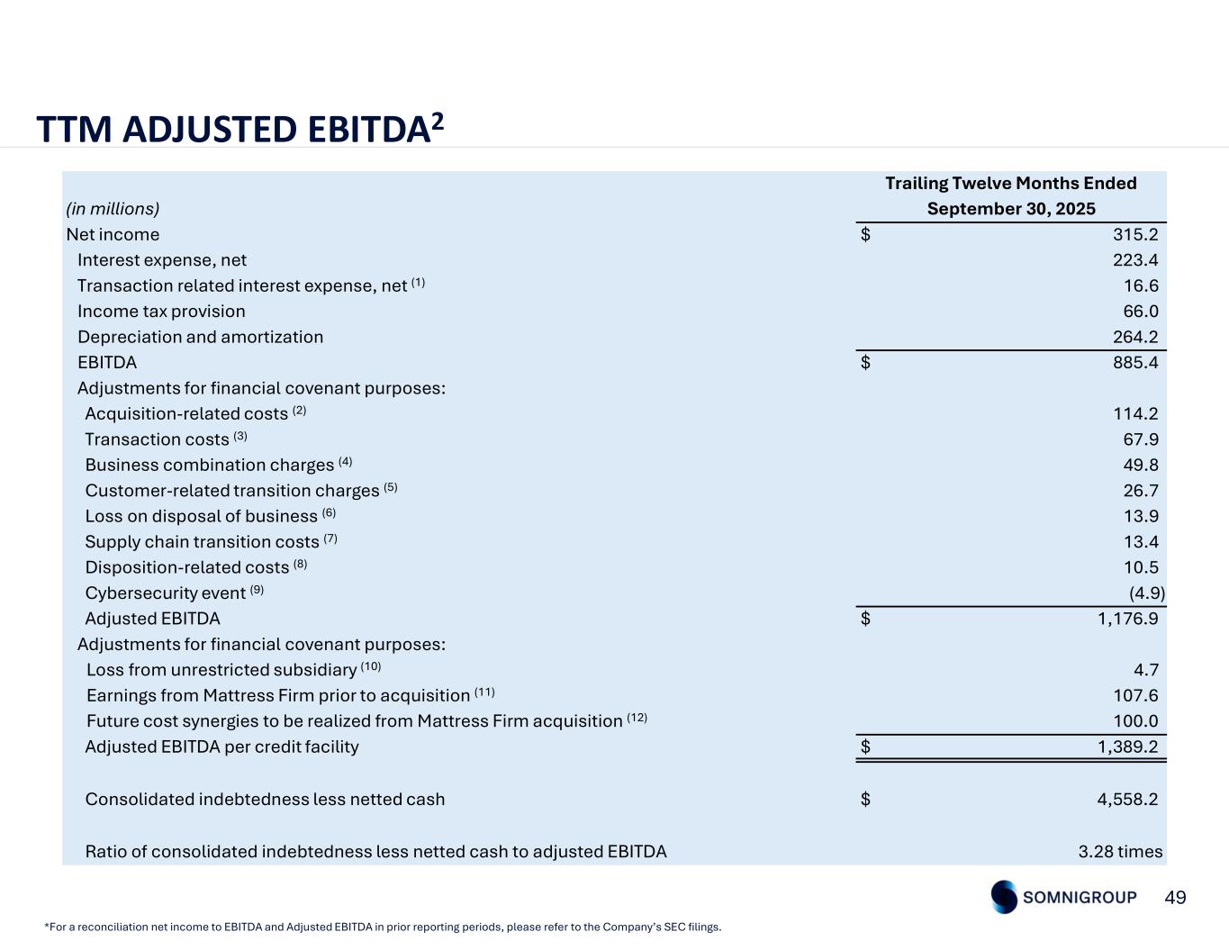 48 ADJUSTED EBITDA2 *For a reconciliation net income to EBITDA and Adjusted EBITDA in prior reporting periods, please refer to the Company’s SEC filings. In the third quarter of 2025, the Company recorded $32.2 million of business combination charges. Cost of sales included $13.4 million of charges primarily related to the refinement of Mattress Firm's multi-branded merchandising plan. Operating expenses included $12.6 million of professional fees and restructuring costs. Other expenses included $6.2 million of charges. (1) In the third quarter of 2025, the Company recorded $7.3 million of supply chain transition costs associated with the consolidation of certain manufacturing facilities. Cost of sales included $0.9 million of transition costs. Other expenses included $6.4 million of costs, primarily related to a manufacturing facility lease termination. In the third quarter of 2024, the Company recorded $8.2 million of supply chain transition costs associated with the consolidation of certain manufacturing facilities, with $8.0 million recorded in cost of sales and $0.2 million recorded in operating expenses. (2) In the third quarter of 2025, the Company recorded $1.3 million of disposition-related costs, primarily related to retail store transition costs incurred for the divestiture to Mattress Warehouse. Operating expenses and other expenses included $0.9 million and $0.4 million of costs, respectively. (3) In the third quarter of 2025, the Company recorded a benefit of $0.9 million of transaction costs related to the Mattress Firm acquisition. Operating expenses included $1.2 million of costs, and other expenses included a benefit of $2.1 million. This benefit relates to reimbursements for previously recorded transaction costs. In the third quarter of 2024, the Company recorded $13.7 million of transaction costs, with $2.4 million in cost of sales and $11.3 million in operating expenses, primarily related to legal and professional fees associated with the Mattress Firm acquisition. (4) Three Months Ended September 30, 2024September 30, 2025(in millions) $ 130.0$ 177.4Net income 30.869.9Interest expense, net 40.856.2Income taxes 51.375.5Depreciation and amortization $ 252.9$ 379.0EBITDA Adjustments: —32.2Business combination charges (1) 8.27.3Supply chain transition costs (2) —1.3Disposition related costs (3) 13.7(0.9)Transaction costs (4) $ 274.8$ 418.9Adjusted EBITDA