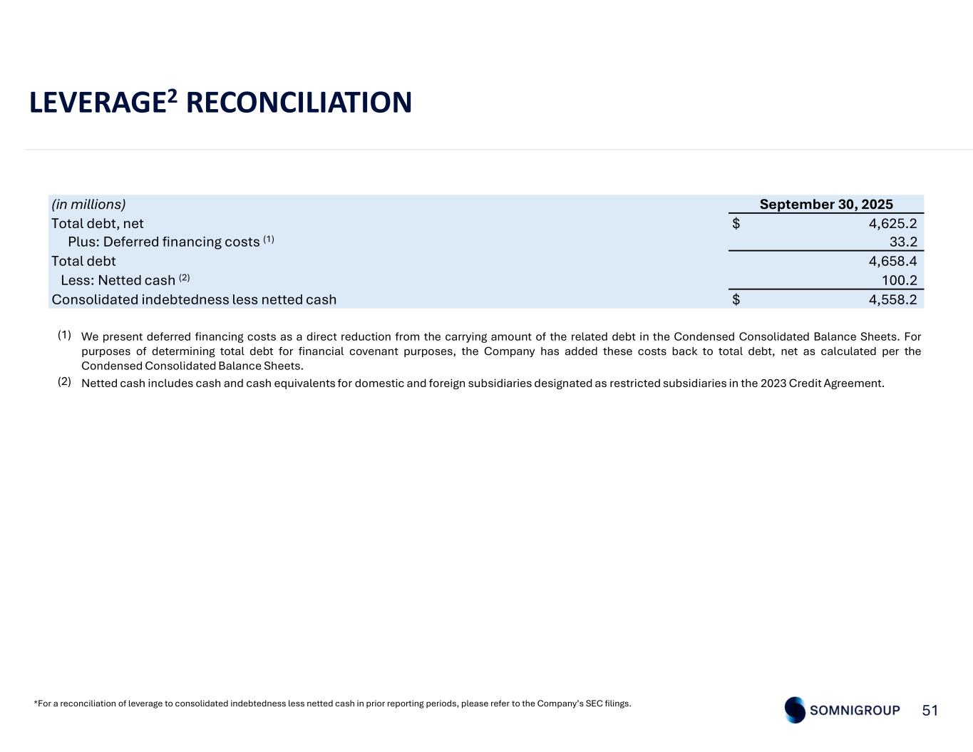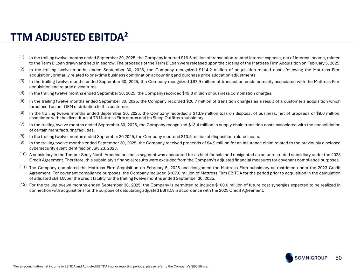 50 TTM ADJUSTED EBITDA2 *For a reconciliation net income to EBITDA and Adjusted EBITDA in prior reporting periods, please refer to the Company’s SEC filings. In the trailing twelve months ended September 30, 2025, the Company incurred $16.6 million of transaction-related interest expense, net of interest income, related to the Term B Loan drawn and held in escrow. The proceeds of the Term B Loan were released upon the closing of the Mattress Firm Acquisition on February 5, 2025. (1) In the trailing twelve months ended September 30, 2025, the Company recognized $114.2 million of acquisition-related costs following the Mattress Firm acquisition, primarily related to one-time business combination accounting and purchase price allocation adjustments. (2) In the trailing twelve months ended September 30, 2025, the Company recognized $67.9 million of transaction costs primarily associated with the Mattress Firm acquisition and related divestitures. (3) In the trailing twelve months ended September 30, 2025, the Company recorded $49.8 million of business combination charges.(4) In the trailing twelve months ended September 30, 2025, the Company recorded $26.7 million of transition charges as a result of a customer's acquisition which foreclosed on our OEM distribution to this customer. (5) In the trailing twelve months ended September 30, 2025, the Company recorded a $13.9 million loss on disposal of business, net of proceeds of $9.0 million, associated with the divestiture of 73 Mattress Firm stores and its Sleep Outfitters subsidiary. (6) In the trailing twelve months ended September 30, 2025, the Company recognized $13.4 million in supply chain transition costs associated with the consolidation of certain manufacturing facilities. (7) In the trailing twelve months ended September 30 2025, the Company recorded $10.5 million of disposition-related costs.(8) In the trailing twelve months ended September 30, 2025, the Company received proceeds of $4.9 million for an insurance claim related to the previously disclosed cybersecurity event identified on July 23, 2023. (9) A subsidiary in the Tempur Sealy North America business segment was accounted for as held for sale and designated as an unrestricted subsidiary under the 2023 Credit Agreement. Therefore, this subsidiary's financial results were excluded from the Company's adjusted financial measures for covenant compliance purposes. (10) The Company completed the Mattress Firm Acquisition on February 5, 2025 and designated the Mattress Firm subsidiary as restricted under the 2023 Credit Agreement. For covenant compliance purposes, the Company included $107.6 million of Mattress Firm EBITDA for the period prior to acquisition in the calculation of adjusted EBITDA per the credit facility for the trailing twelve months ended September 30, 2025. (11) For the trailing twelve months ended September 30, 2025, the Company is permitted to include $100.0 million of future cost synergies expected to be realized in connection with acquisitions for the purpose of calculating adjusted EBITDA in accordance with the 2023 Credit Agreement. (12)