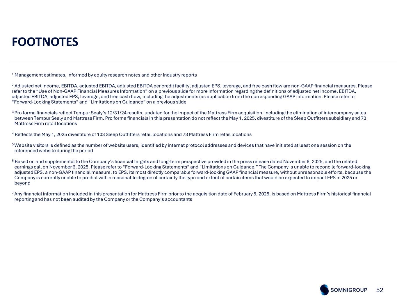52 FOOTNOTES 1 Management estimates, informed by equity research notes and other industry reports 2 Adjusted net income, EBITDA, adjusted EBITDA, adjusted EBITDA per credit facility, adjusted EPS, leverage, and free cash flow are non-GAAP financial measures. Please refer to the “Use of Non-GAAP Financial Measures Information” on a previous slide for more information regarding the definitions of adjusted net income, EBITDA, adjusted EBITDA, adjusted EPS, leverage, and free cash flow, including the adjustments (as applicable) from the corresponding GAAP information. Please refer to “Forward-Looking Statements” and “Limitations on Guidance” on a previous slide 3 Pro forma financials reflect Tempur Sealy’s 12/31/24 results, updated for the impact of the Mattress Firm acquisition, including the elimination of intercompany sales between Tempur Sealy and Mattress Firm. Pro forma financials in this presentation do not reflect the May 1, 2025, divestiture of the Sleep Outfitters subsidiary and 73 Mattress Firm retail locations 4 Reflects the May 1, 2025 divestiture of 103 Sleep Outfitters retail locations and 73 Mattress Firm retail locations 5 Website visitors is defined as the number of website users, identified by internet protocol addresses and devices that have initiated at least one session on the referenced website during the period 6 Based on and supplemental to the Company’s financial targets and long-term perspective provided in the press release dated November 6, 2025, and the related earnings call on November 6, 2025. Please refer to “Forward-Looking Statements” and “Limitations on Guidance.” The Company is unable to reconcile forward‐looking adjusted EPS, a non‐GAAP financial measure, to EPS, its most directly comparable forward‐looking GAAP financial measure, without unreasonable efforts, because the Company is currently unable to predict with a reasonable degree of certainty the type and extent of certain items that would be expected to impact EPS in 2025 or beyond 7 Any financial information included in this presentation for Mattress Firm prior to the acquisition date of February 5, 2025, is based on Mattress Firm’s historical financial reporting and has not been audited by the Company or the Company’s accountants