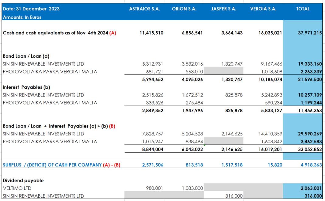 WHEREAS as of 31 December 2023, the 4 Greek SPVs have outstanding debts to Lenders/Assignors by virtue of bond loan and loan agreements, the aggregate amount of which (principal and interest) is EUR 33,052,852.00 (the “Assigned Debt”)the detailed amounts of the Accumulated Greek Bank Deposits and the Assigned Debt per Greek SPV are set out in Annex B attached hereto and SPI hereby represents and warrants that the amounts of the Assigned Debt are accurate and constitute the outstanding indebtedness of the 4 Greek SPVs (as acknowledged by each of them) as at the date of this Settlement Agreement.