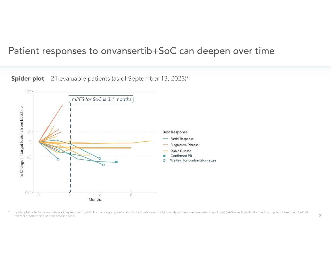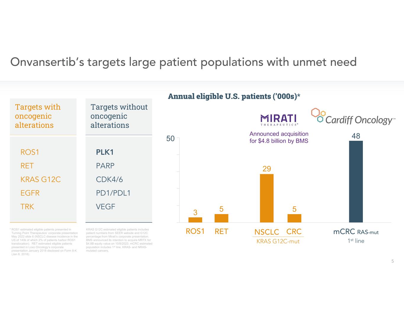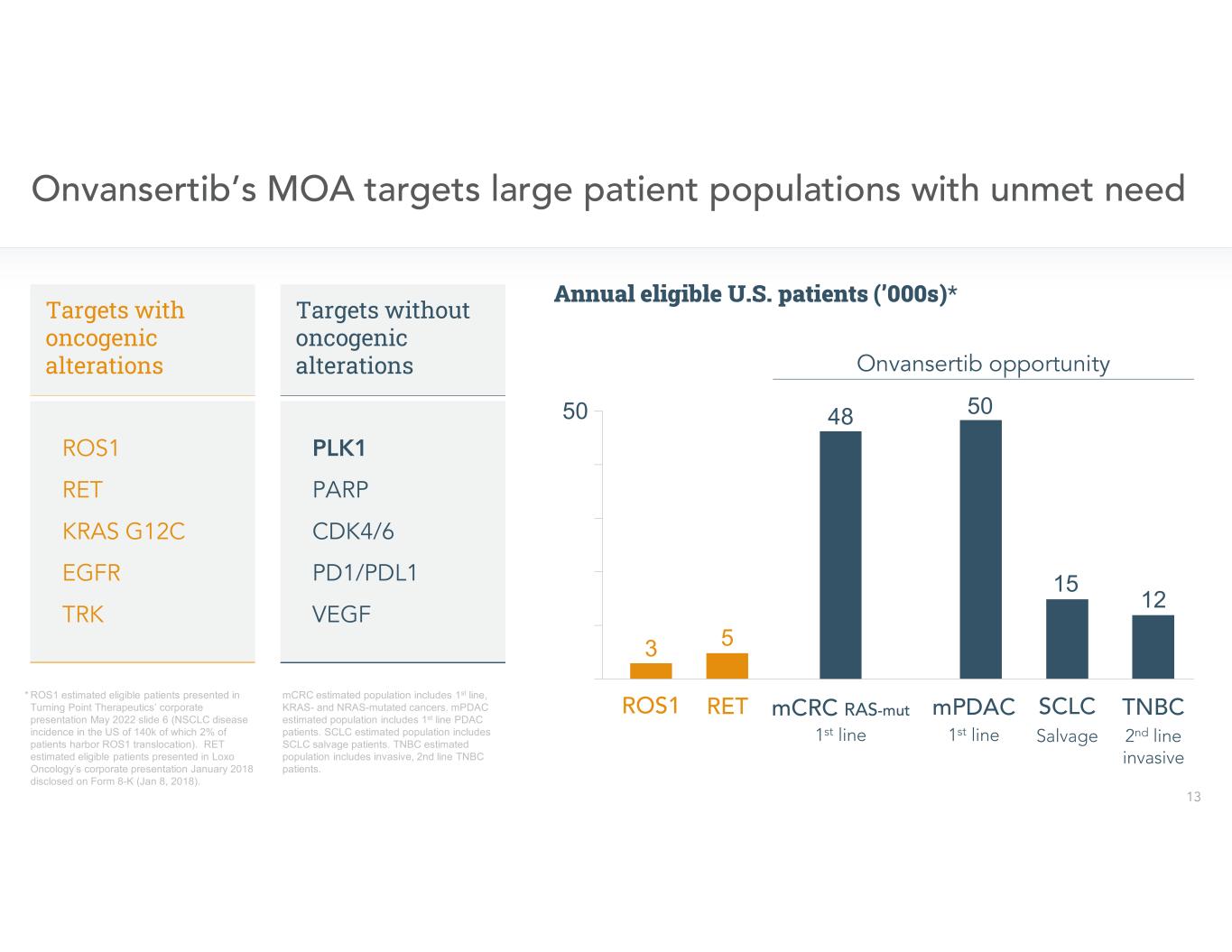 Targets with oncogenic alterations Targets without oncogenic alterations * ROS1 estimated eligible patients presented in Turning Point Therapeutics’ corporate presentation May 2022 slide 6 (NSCLC disease incidence in the US of 140k of which 2% of patients harbor ROS1 translocation). RET estimated eligible patients presented in Loxo Oncology’s corporate presentation January 2018 disclosed on Form 8-K (Jan 8, 2018). mCRC estimated population includes 1st line, KRAS- and NRAS-mutated cancers. mPDAC estimated population includes 1st line PDAC patients. SCLC estimated population includes SCLC salvage patients. TNBC estimated population includes invasive, 2nd line TNBC patients. 53 15 12 5050 48 Annual eligible U.S. patients (’000s)*