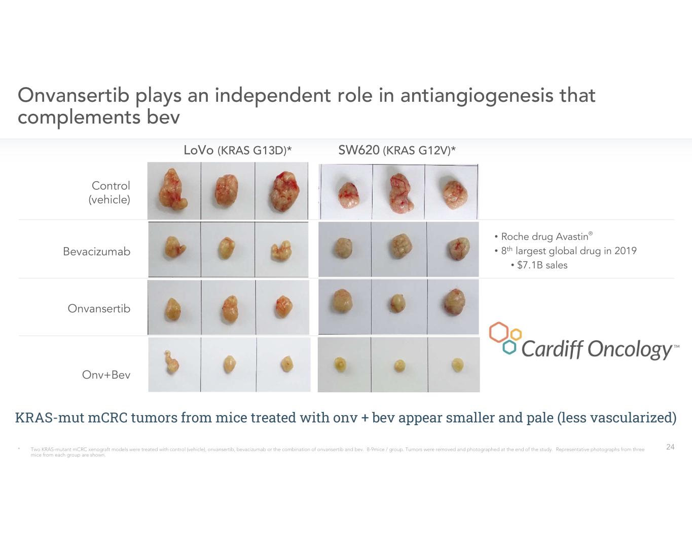 KRAS-mut mCRC tumors from mice treated with onv + bev appear smaller and pale (less vascularized) • • •