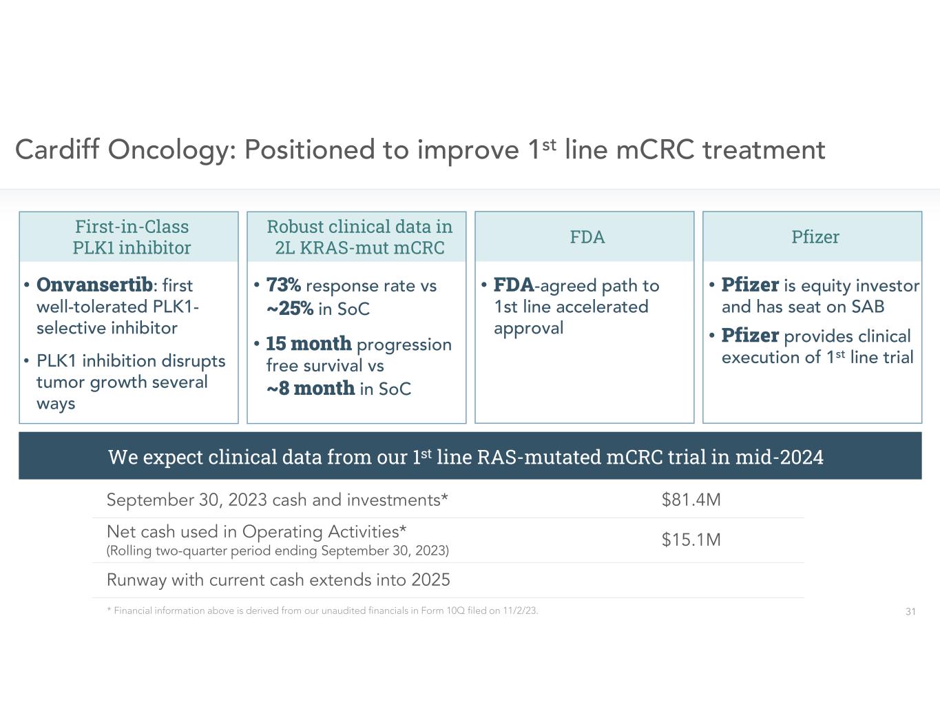 First-in-Class PLK1 inhibitor • Onvansertib • FDA • FDA Robust clinical data in 2L KRAS-mut mCRC • 73% ~25% • 15 month ~8 month Pfizer • Pfizer • Pfizer We expect clinical data from our 1st line RAS-mutated mCRC trial in mid-2024 Runway with current cash extends into 2025