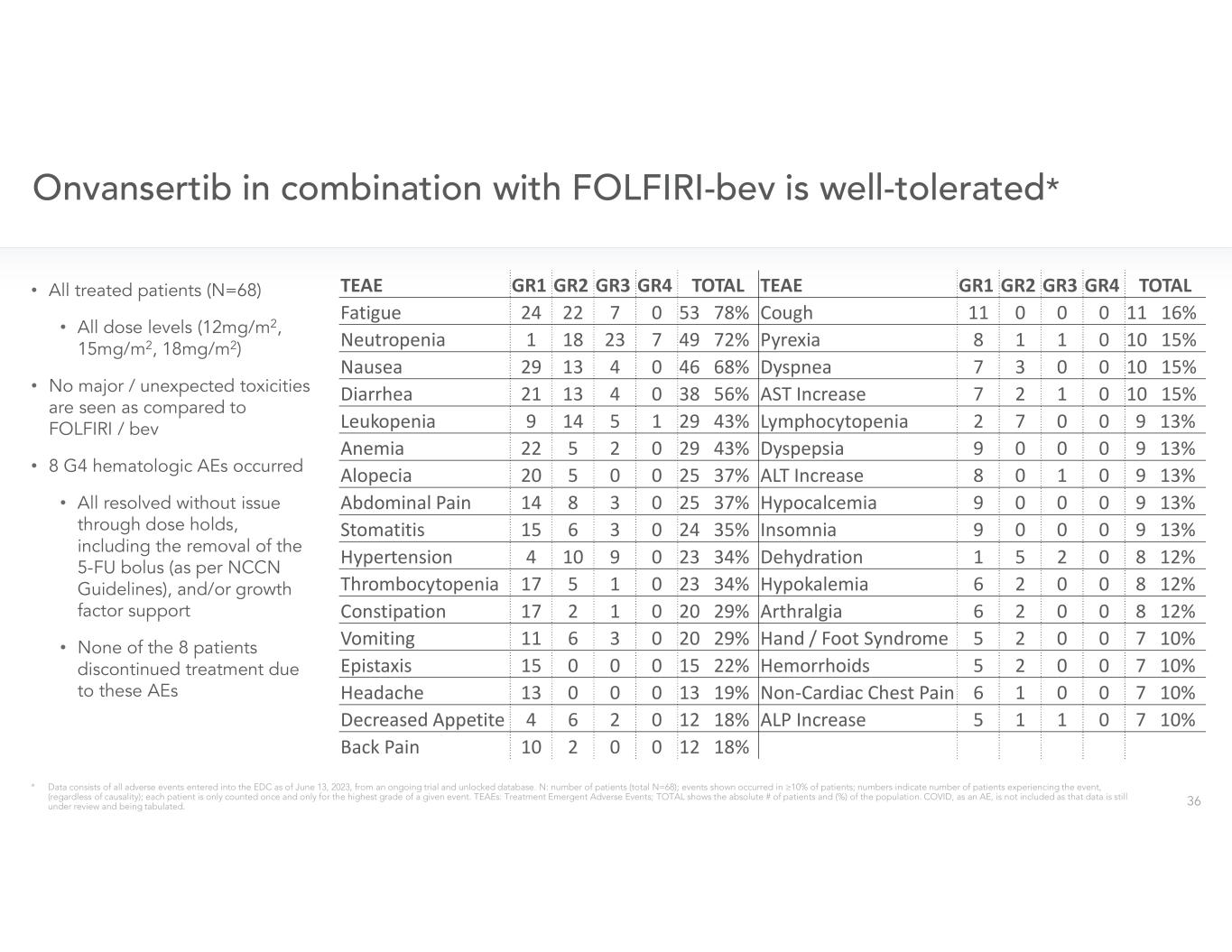 TOTALGR4GR3GR2GR1TEAETOTALGR4GR3GR2GR1TEAE 11 16%00011Cough53 78%072224Fatigue 10 15%0118Pyrexia49 72%723181Neutropenia 10 15%0037Dyspnea46 68%041329Nausea 10 15%0127AST Increase38 56%041321Diarrhea 9 13%0072Lymphocytopenia29 43%15149Leukopenia 9 13%0009Dyspepsia29 43%02522Anemia 9 13%0108ALT Increase25 37%00520Alopecia 9 13%0009Hypocalcemia25 37%03814Abdominal Pain 9 13%0009Insomnia24 35%03615Stomatitis 8 12%0251Dehydration23 34%09104Hypertension 8 12%0026Hypokalemia23 34%01517Thrombocytopenia 8 12%0026Arthralgia20 29%01217Constipation 7 10%0025Hand / Foot Syndrome20 29%03611Vomiting 7 10%0025Hemorrhoids15 22%00015Epistaxis 7 10%0016Non-Cardiac Chest Pain13 19%00013Headache 7 10%0115ALP Increase12 18%0264Decreased Appetite 12 18%00210Back Pain • • • • • •
