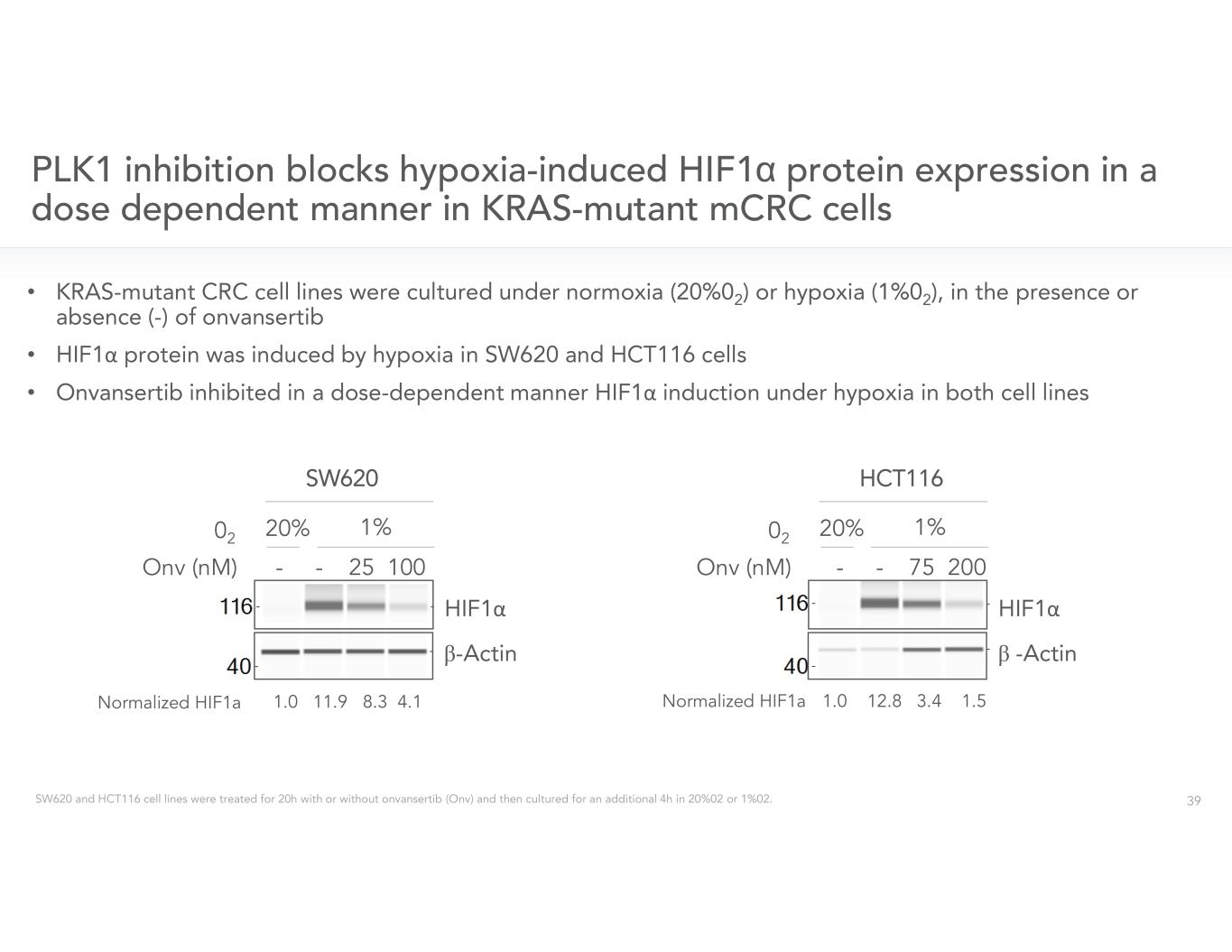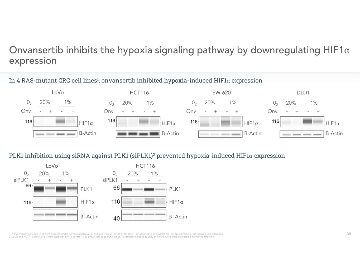 α PLK1 inhibition using siRNA against PLK1 (siPLK1)2 prevented hypoxia-induced HIF1α expression α α α αα In 4 RAS-mutant CRC cell lines1, onvansertib inhibited hypoxia-induced HIF1α expression β α β α