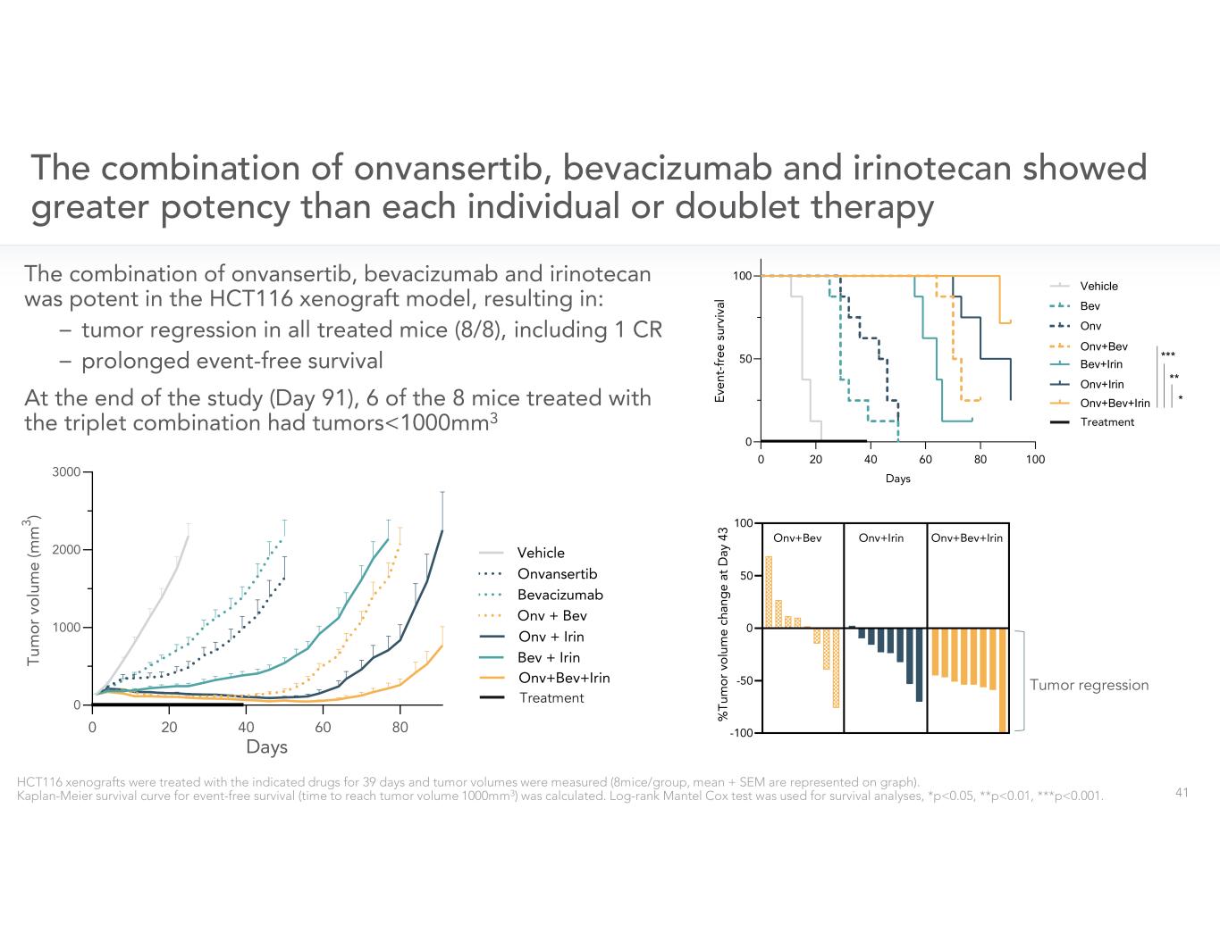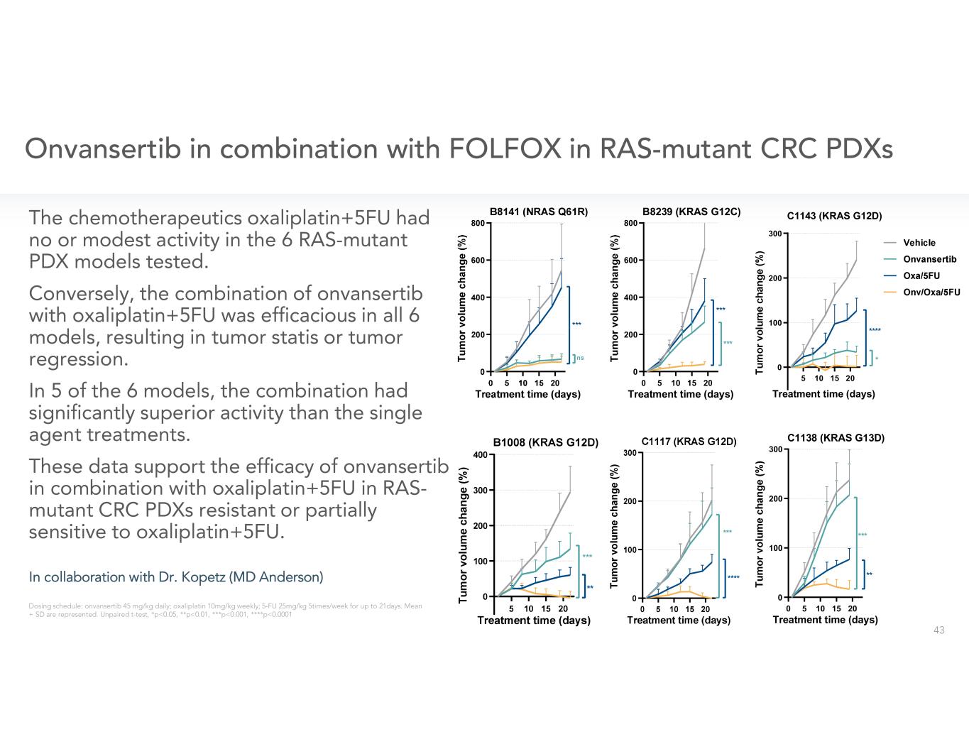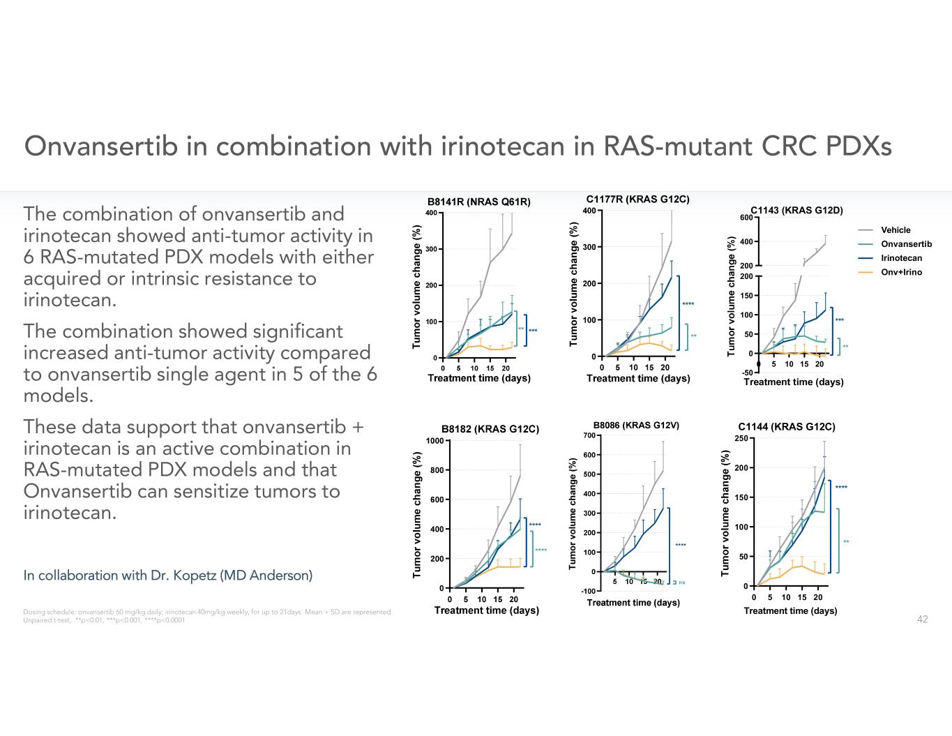 0 5 10 15 20 -50 0 50 100 150 200 200 400 600 Treatment time (days) C1143 (KRAS G12D) ** *** 0 5 10 15 20 0 50 100 150 200 250 Treatment time (days) C1144 (KRAS G12C) ** **** Vehicle Onv+Irino Onvansertib Irinotecan