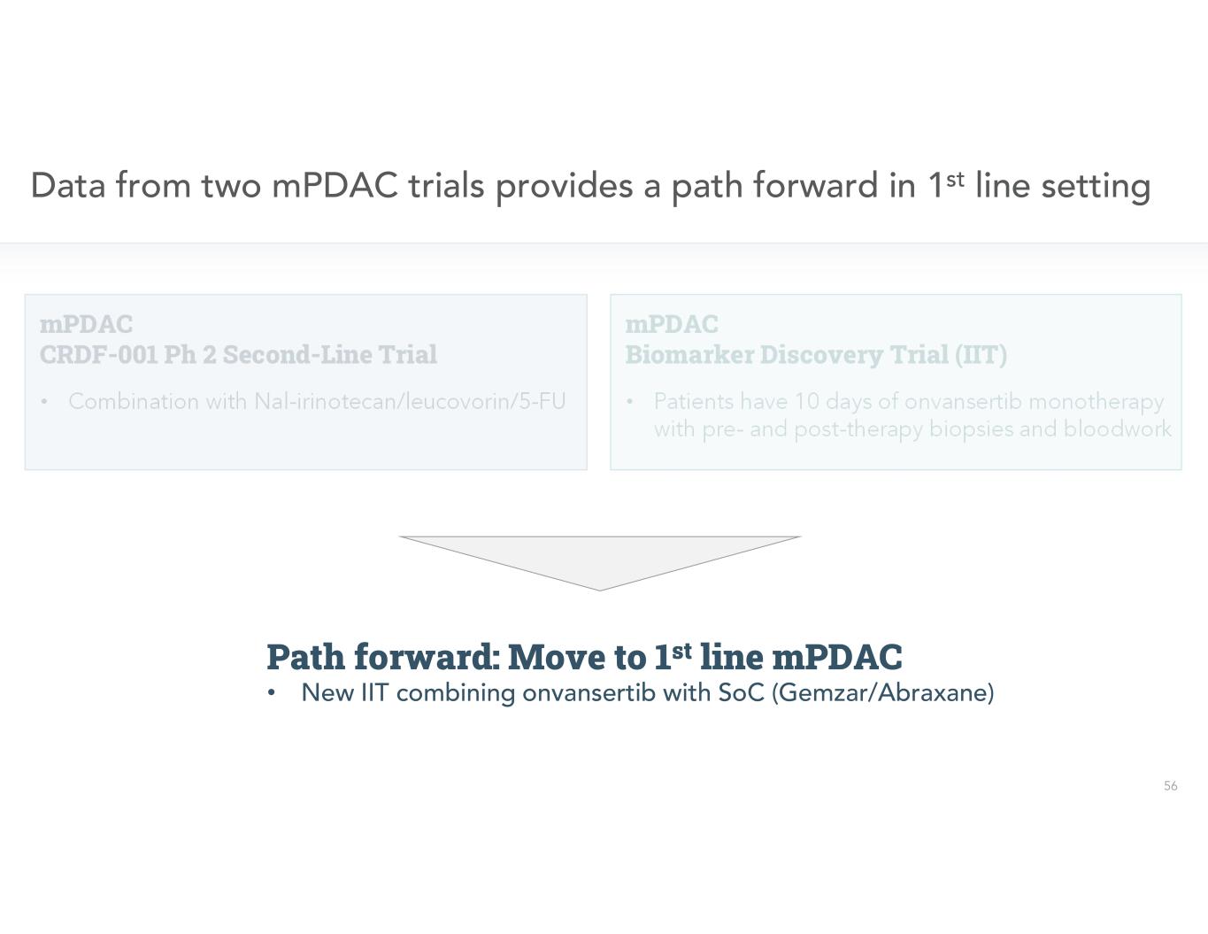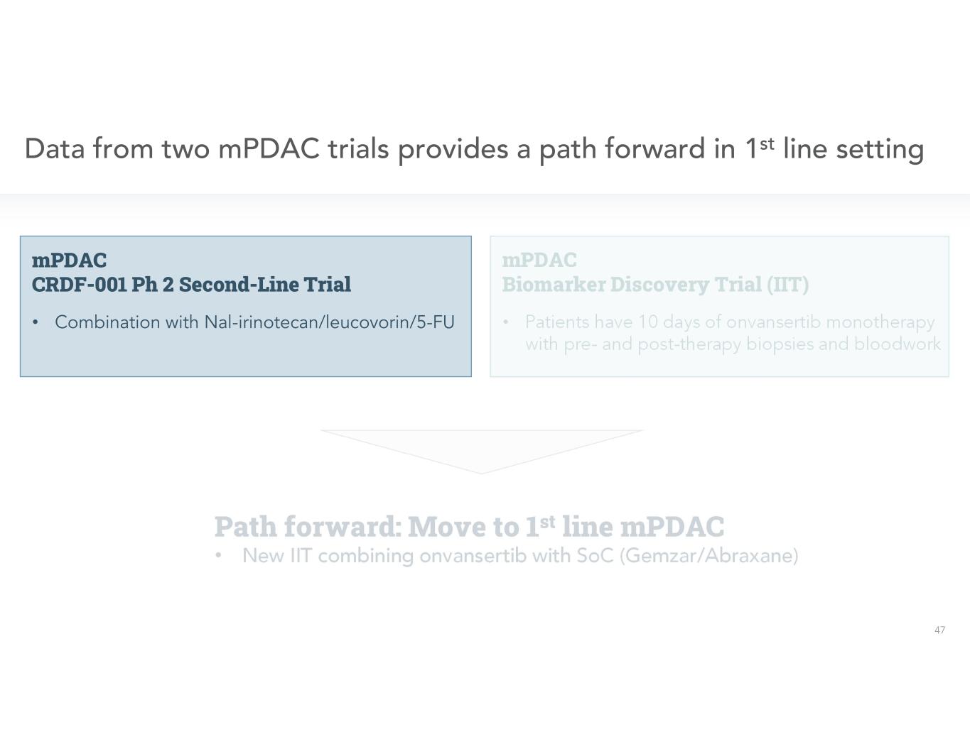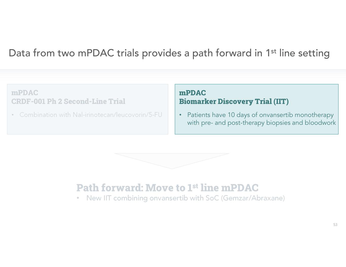 mPDAC CRDF-001 Ph 2 Second-Line Trial • mPDAC Biomarker Discovery Trial (IIT) • Path forward: Move to 1st line mPDAC •