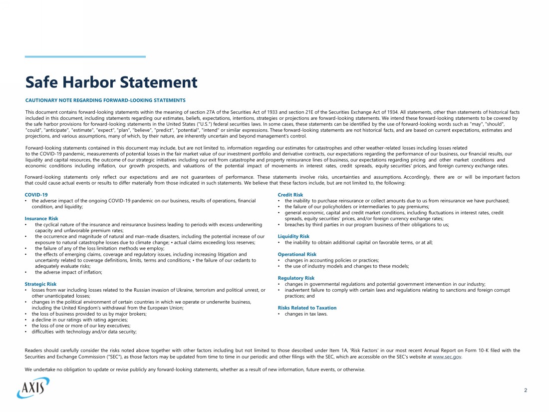 Safe Harbor Statement 2 CAUTIONARY NOTE REGARDING FORWARD - LOOKING STATEMENTS This document contains forward - looking statements within the meaning of section 27A of the Securities Act of 1933 and section 21 E of the Securities Exchange Act of 1934. All statements, other than statements of historical facts included in this document, including statements regarding our estimates, beliefs, expectations, intentions, strategies or pro jec tions are forward - looking statements. We intend these forward - looking statements to be covered by the safe harbor provisions for forward - looking statements in the United States ("U.S.") federal securities laws. In some cases, these statements can be identified by the use of forward - looking words such as "may", "should", "could", "anticipate", "estimate", "expect", "plan", "believe", "predict", "potential", "intend" or similar expressions. Thes e f orward - looking statements are not historical facts, and are based on current expectations, estimates and projections, and various assumptions, many of which, by their nature, are inherently uncertain and beyond management's contro l. Forward - looking statements contained in this document may include, but are not limited to, information regarding our estimates f or catastrophes and other weather - related losses including losses related to the COVID - 19 pandemic, measurements of potential losses in the fair market value of our investment portfolio and derivative c ontracts, our expectations regarding the performance of our business, our financial results, our liquidity and capital resources, the outcome of our strategic initiatives including our exit from catastrophe and property re ins urance lines of business, our expectations regarding pricing and other market conditions and economic conditions including inflation, our growth prospects, and valuations of the potential impact of moveme nts in interest rates, credit spreads, equity securities' prices, and foreign currency exchange rates. Forward - looking statements only reflect our expectations and are not guarantees of performance . These statements involve risks, uncertainties and assumptions . Accordingly, there are or will be important factors that could cause actual events or results to differ materially from those indicated in such statements . We believe that these factors include, but are not limited to, the following : COVID - 19 • the adverse impact of the ongoing COVID - 19 pandemic on our business, results of operations, financial condition, and liquidity; Insurance Risk • the cyclical nature of the insurance and reinsurance business leading to periods with excess underwriting capacity and unfavorable premium rates; • the occurrence and magnitude of natural and man - made disasters, including the potential increase of our exposure to natural catastrophe losses due to climate change; • actual claims exceeding loss reserves; • the failure of any of the loss limitation methods we employ; • the effects of emerging claims, coverage and regulatory issues, including increasing litigation and uncertainty related to coverage definitions, limits, terms and conditions; • the failure of our cedants to adequately evaluate risks; • the adverse impact of inflation; Strategic Risk • losses from war including losses related to the Russian invasion of Ukraine, terrorism and political unrest, or other unanticipated losses; • changes in the political environment of certain countries in which we operate or underwrite business, including the United Kingdom's withdrawal from the European Union; • the loss of business provided to us by major brokers; • a decline in our ratings with rating agencies; • the loss of one or more of our key executives; • difficulties with technology and/or data security; Credit Risk • the inability to purchase reinsurance or collect amounts due to us from reinsurance we have purchased; • the failure of our policyholders or intermediaries to pay premiums; • general economic, capital and credit market conditions, including fluctuations in interest rates, credit spreads, equity securities' prices, and/or foreign currency exchange rates; • breaches by third parties in our program business of their obligations to us; Liquidity Risk • the inability to obtain additional capital on favorable terms, or at all; Operational Risk • changes in accounting policies or practices; • the use of industry models and changes to these models; Regulatory Risk • changes in governmental regulations and potential government intervention in our industry; • inadvertent failure to comply with certain laws and regulations relating to sanctions and foreign corrupt practices; and Risks Related to Taxation • changes in tax laws. Readers should carefully consider the risks noted above together with other factors including but not limited to those described under Item 1 A, 'Risk Factors' in our most recent Annual Report on Form 10 - K filed with the Securities and Exchange Commission ("SEC"), as those factors may be updated from time to time in our periodic and other filings with the SEC, which are accessible on the SEC's website at www . sec . gov . We undertake no obligation to update or revise publicly any forward - looking statements, whether as a result of new information, future events, or otherwise .