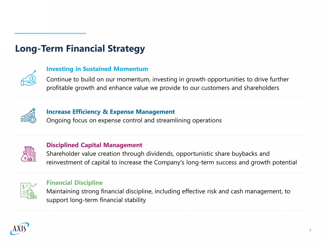 Advancing Global Leadership in Specialty Risk 4 AXIS Strengths AXIS is continuing to evolve our business to increase profitability, lower volatility, and strengthen the portfolio, establishing a strong position in the fastest growing specialty markets Risk Management Solutions Track record of providing bespoke risk management solutions to unique risks Strong Relationships Strong and lasting relationships with key distribution partners and clients in highly attractive markets Diversified Specialty Portfolio Attractive global portfolio of specialty insurance and complementary reinsurance business Leveraging AXIS Strengths Focus on markets where we have demonstratable relevance, scale, underwriting expertise, and path for profitable growth Reputation for Client Services Industry leading claims services Employee Engagement Strong employee engagement and workplace culture, leading to recruitment and retention of top talent and consistency of service to our customers