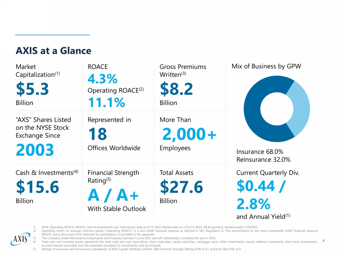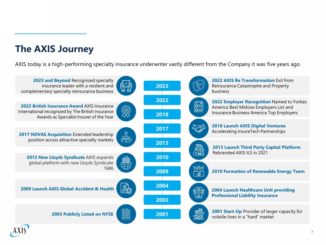 AXIS at a Glance 6 1) GPW, Operating ROACE , ROACE , Cash & Investments and Total Assets data as of YE 2022; Market data as of 01/31/2023; $0.44 quarterly dividend paid 1/18/20 23. 2) Operating return on average common equity (“operating ROACE ”) is a non - GAAP financial measure as defined in SEC Regulation G . The reconciliation to the most comparable GAAP financial measure ROACE , and a discussion of its rationale for presentation is provided in the appendix . 3) The Company exited Reinsurance Catastrophe and Property business in June 2022 and will substantially complete this exit in 2023 . 4) Total cash and invested assets represents the total cash and cash equivalents, fixed maturities, equity securities, mortgage loans, other investments, equity method investments, short - term investments, accrued interest receivable and net receivable (payable) for investments sold (purchased) . 5) Ratings of insurance and reinsurance subsidiaries of AXIS Capital Holdings Limited . S&P Financial Strength Rating (FSR) of A+ and A . M . Best FSR of A . Financial Strength Rating (5 ) A / A+ With Stable Outlook Market Capitalization (1) $5.3 Billion Gross Premiums Written (3) $8.2 Billion ROACE 4.3% Operating ROACE (2) 11.1% “AXS” Shares Listed on the NYSE Stock Exchange Since 2003 Represented in 18 Offices Worldwide More Than 2,000+ Employees Cash & Investments (4) $15.6 Billion Total Assets $27.6 Billion Mix of Business by GPW Current Quarterly Div. $0.44 / 2.8% and Annual Yield (1) Insurance 68.0% Reinsurance 32.0%