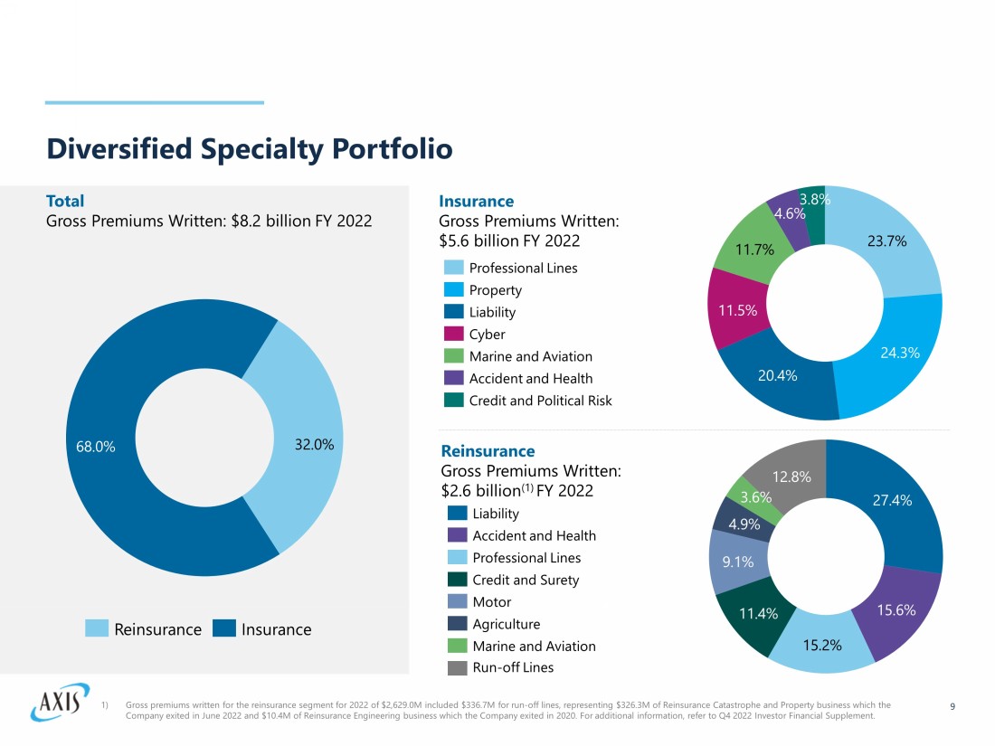 Our Business Today 8 • The AXIS portfolio is well - positioned in attractive growth markets across the globe. This includes insurance E&S Property, E&S Casualty, Lloyd’s, Professional Lines as well as profitable specialty Reinsurance lines • The Insurance business grew GPW 15% in 2022, while we repositioned our complementary reinsurance book • Favorable market conditions should enable continued growth and profitability across our Company 1) Market data as of 01/31/2023. Strong Market Position Consistent Margin Improvement • Reduced volatility to produce consistent, strong underwriting results supported by conservative, well - performing investment portfolio • Proven, strong, specialty insurance business with a complementary reinsurance operation is well - positioned to deliver profitable growth across all market cycles • Global platform with improving profitability trading at attractive 2.8% (1) dividend yield • Launched AXIS Wholesale Division focused on serving needs of wholesale distribution channel with even broader product offerings • Advancing capabilities to address more transactional specialist business (small to mid - sized customers) with our key distribution partners • Developing capabilities to address more transactional specialty business • Across our book, rate increases up on average 9% in 2022, keeping pace with trend • Industry and macro - economic dynamics likely to drive further pricing improvements through insurance and reinsurance in 2023 and beyond • Disciplined portfolio management has provided strengthened and more consistent underlying results; Net investment income expected to grow from current levels, helped by higher interest rates • On a pro - forma basis, adjusting for the exit from Catastrophe and Property reinsurance business, combined ratio has improved by 4.2 points from 2019 • We expect all - in Group combined ratio to continue to improve Invested in Growth Areas Pricing Momentum Positioned for Profitable Growth