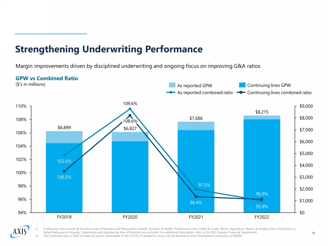 Diversified Specialty Portfolio 9 Total Gross Premiums Written: $8.2 billion FY 2022 32.0% 68.0% 23.7% 24.3% 20.4% 11.5% 11.7% 3.8% 4.1% Insurance Gross Premiums Written: $5.6 billion FY 2022 Reinsurance Gross Premiums Written: $2.6 billion (1) FY 2022 4.6% Cyber Professional Lines Property Liability Accident and Health Credit and Political Risk Marine and Aviation 1) Gross premiums written for the reinsurance segment for 2022 of $2,629.0M included $336.7M for run - off lines, representing $326.3 M of Reinsurance Catastrophe and Property business which the C ompany exited in June 2022 and $10.4M of Reinsurance Engineering business which the C ompany exited in 2020. For additional information, refer to Q4 2022 Investor Financial Supplement. Reinsurance Insurance Liability Accident and Health Professional Lines Motor Credit and Surety Agri culture Marine and Aviation Run - off Lines 27.4% 15.6% 15.2% 11.4% 9.1% 4.9% 3.6% 12.8%