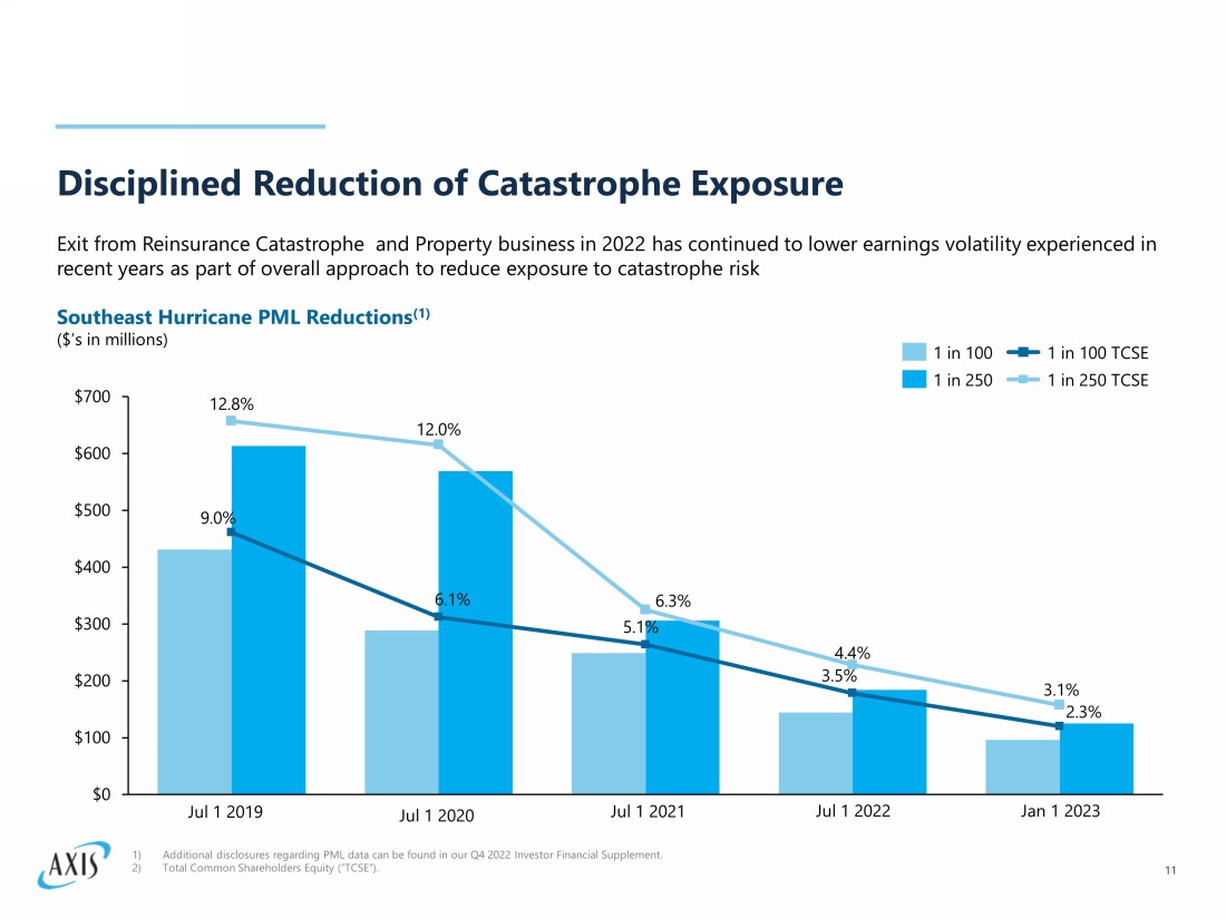 Strengthening Underwriting Performance 10 Margin improvements driven by disciplined underwriting and ongoing focus on improving G&A ratios 102.6% 109.6% 97.5% 95.8% 100.2% 96.4% 96.0% 94% 96% 98% 100% 102% 104% 106% 108% 110% $0 $1,000 $2,000 $3,000 $4,000 $5,000 $6,000 $7,000 $8,000 $9,000 FY 2022 FY 2020 FY 2019 $ 7,686 108.6% FY 2021 $6,899 $6,827 $8,215 As reported GPW Continuing lines combined ratio Continuing lines GPW As reported combined ratio GPW vs Combined Ratio ($’s in millions) 1) Continuing Lines include all Insurance lines of business and Reinsurance Liability, Accident & Health, Professional Lines, Cr edi t & Surety, Motor, Agriculture, Marine & Aviation lines of business i.e., Exited Reinsurance Property, Catastrophe and Engineering lines of business are excluded. For additional information, refer to Q4 2022 Investor Financial Supplement. 2) The combined ratio in 2020 includes 8.2 points attributable to the COVID - 19 pandemic losses, net of reinsurance and reinstatemen t premiums, of $360M.