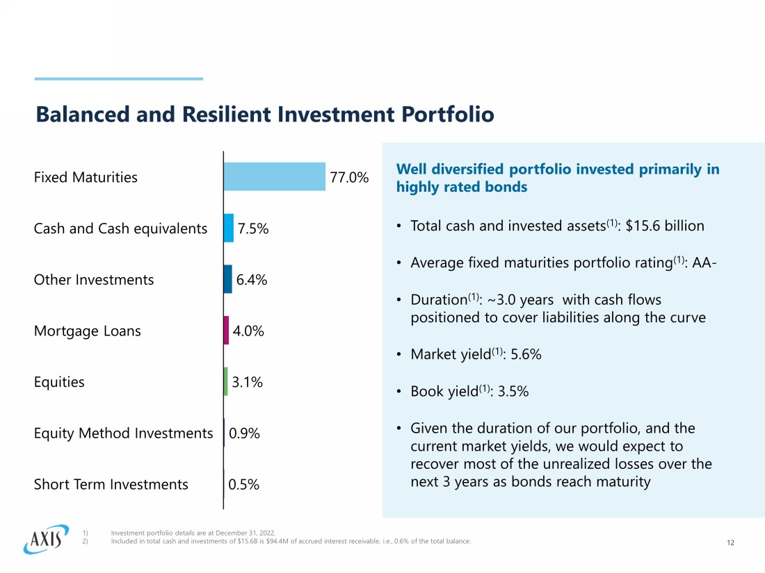 Disciplined Reduction of Catastrophe Exposure 11 9.0% 6.1% 5.1% 3.5% 2.3% 12.8% 12.0% 6.3% 4.4% 3.1% $0 $100 $200 $300 $400 $500 $600 $700 Jul 1 2021 Jul 1 2019 Jul 1 2020 Jul 1 2022 Jan 1 2023 1 in 100 1 in 250 1 in 100 TCSE 1 in 250 TCSE Exit from Reinsurance Catastrophe and Property business in 2022 has continued to lower earnings volatility experienced in recent years as part of overall approach to reduce exposure to catastrophe risk Southeast Hurricane PML Reductions (1) ($’s in millions) 1) Additional disclosures regarding PML data can be found in our Q4 2022 Investor Financial Supplement. 2) Total Common Shareholders Equity (“ TCSE ”).