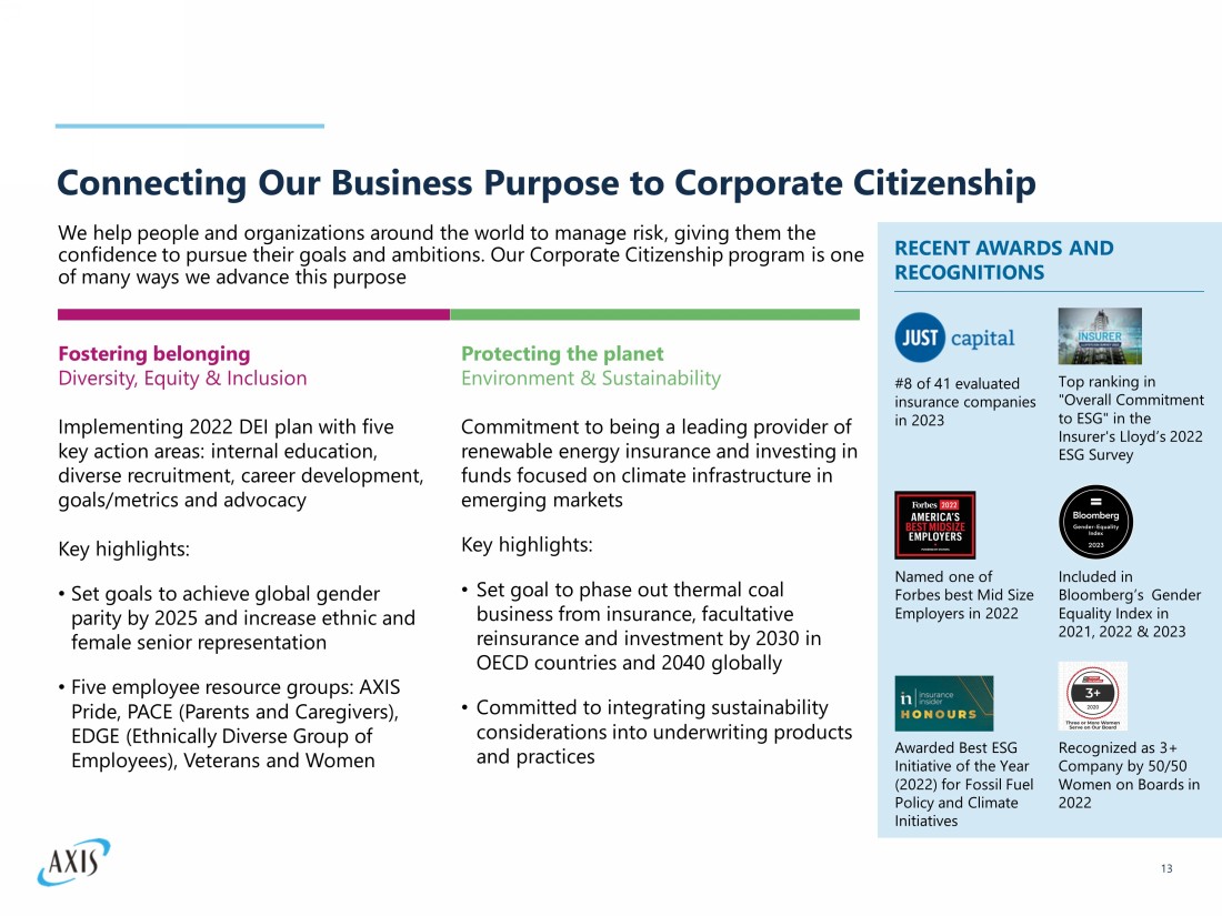 Balanced and Resilient Investment Portfolio 12 Well diversified portfolio invested primarily in highly rated bonds • Total cash and invested assets (1) : $15.6 billion • Average fixed maturities portfolio rating (1) : AA - • Duration (1) : ~3.0 years with cash flows positioned to cover liabilities along the curve • Market yield (1) : 5.6% • Book yield (1) : 3.5% • Given the duration of our portfolio, and the current market yields, we would expect to recover most of the unrealized losses over the next 3 years as bonds reach maturity 77.0% 7.5% 6.4% 4.0% 3.1% 0.9% 0.5% Equities Fixed Maturities Short Term Investments Cash and Cash equivalents Other Investments Mortgage Loans Equity Method Investments 1) Investment portfolio details are at December 31, 2022. 2) Included in total cash and investments of $15.6B is $94.4M of accrued interest receivable, i.e., 0.6% of the total balance.