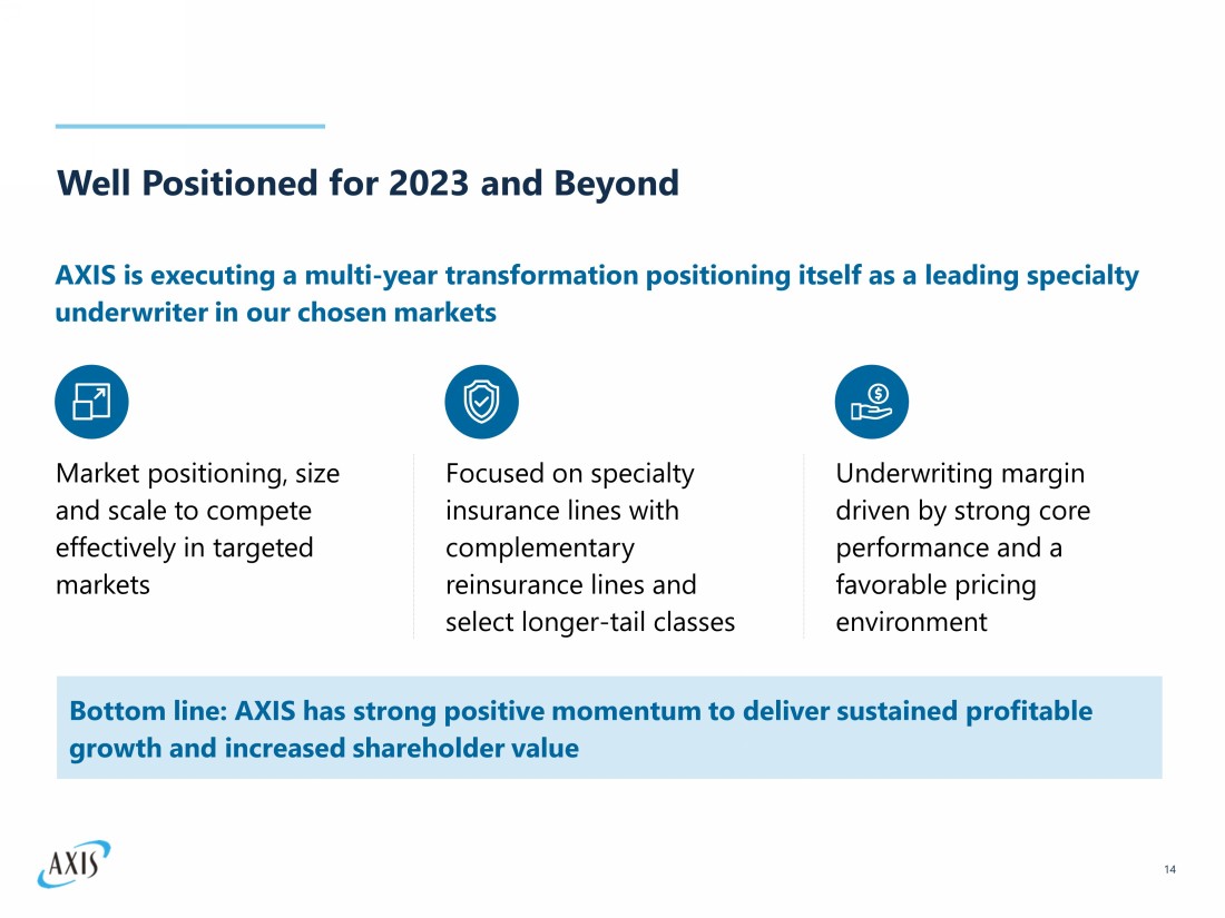 Well Positioned for 2023 and Beyond 14 Bottom line: AXIS has strong positive momentum to deliver sustained profitable growth and increased shareholder value AXIS is executing a multi - year transformation positioning itself as a leading specialty underwriter in our chosen markets Focused on specialty insurance lines with complementary reinsurance lines and select longer - tail classes Market positioning, size and scale to compete effectively in targeted markets Underwriting margin driven by strong core performance and a favorable pricing environment