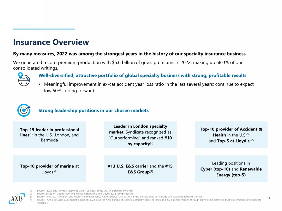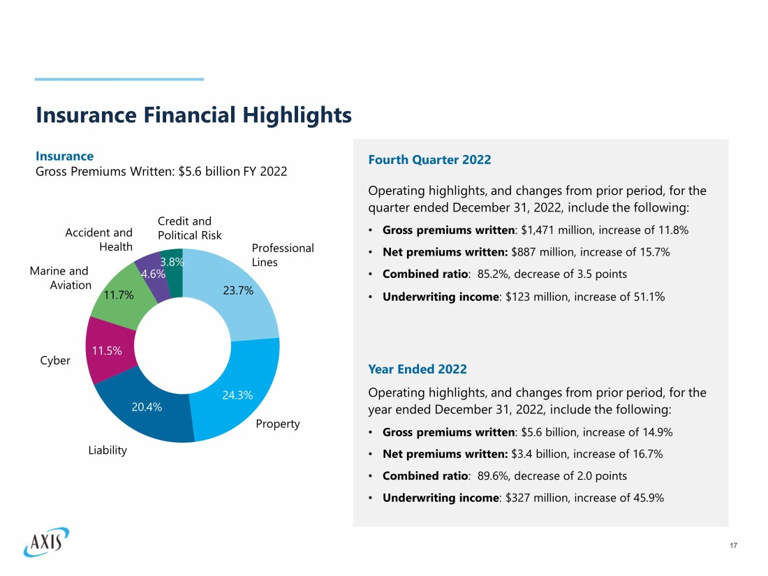 Insurance Overview 16 Well - diversified, attractive portfolio of global specialty business with strong, profitable results • Meaningful improvement in ex - cat accident year loss ratio in the last several years; continue to expect low 50%s going forward Leading positions in Cyber (top - 10) and Renewable Energy (top - 5) Leader in London specialty market ; Syndicate recognized as “Outperforming” and ranked #10 by capacity (2) Top - 10 provider of Accident & Health in the U.S. (3) and Top - 5 at Lloyd’s (2) Top - 10 provider of marine at Lloyds (2) #13 U.S. E&S carrier and the #15 E&S Group (4) Top - 15 leader in professional lines (1) in the U.S., London, and Bermuda By many measures, 2022 was among the strongest years in the history of our specialty insurance business We generated record premium production with $5.6 billion of gross premiums in 2022, making up 68.0% of our consolidated writings. Strong leadership positions in our chosen markets 1) Source : 2021 SNL Annual Statement Data – US Legal Entity OLCM excluding Med Mal . 2) Source : Based on Lloyds reporting, Lloyds Insight Hub and Lloyds 2022 stamp capacity . 3) Source : NAIC 2021 Accident and Health Policy Experience Report shows AXIS as the # 8 P&C carrier ; does not include Life, Accident & Health carriers . 4) Source : AM Best Sept 2022 report based on 2021 data for AXIS Surplus Insurance Company ; does not include E&S business written through Lloyd’s and admitted business through Wholesale US Programs .