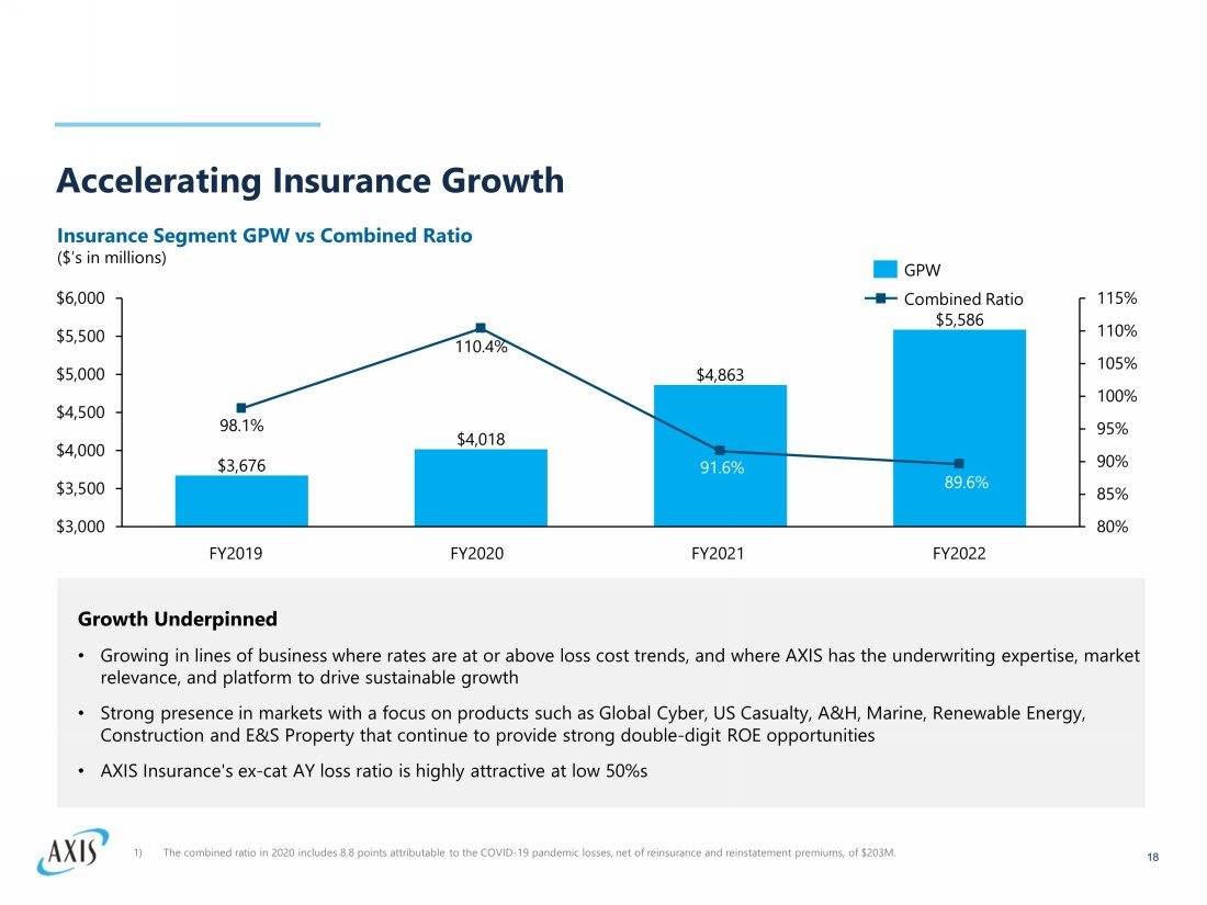 Insurance Financial Highlights 17 Fourth Quarter 2022 Operating highlights, and changes from prior period, for the quarter ended December 31, 2022, include the following: • Gross premiums written : $1,471 million, increase of 11.8% • Net premiums written: $887 million, increase of 15.7% • Combined ratio : 85.2%, decrease of 3.5 points • Underwriting income : $123 million, increase of 51.1 % Year Ended 2022 Operating highlights, and changes from prior period, for the year ended December 31, 2022, include the following: • Gross premiums written : $5.6 billion, increase of 14.9% • Net premiums written: $3.4 billion, increase of 16.7% • Combined ratio : 89.6%, decrease of 2.0 points • Underwriting income : $327 million, increase of 45.9% Insurance Gross Premiums Written: $5.6 billion FY 2022 23.7% 24.3% 20.4% 11.5% 11.7% 4.6% 3.8% Professional Lines Property Accident and Health Liability Credit and Political Risk Cyber Marine and Aviation
