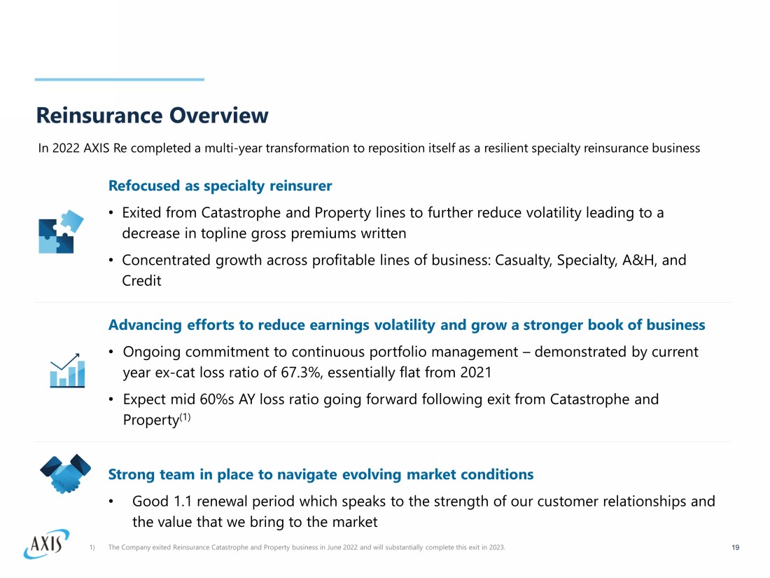 Accelerating Insurance Growth 18 Growth Underpinned • Growing in lines of business where rates are at or above loss cost trends, and where AXIS has the underwriting expertise, mar ket relevance, and platform to drive sustainable growth • Strong presence in markets with a focus on products such as Global Cyber, US Casualty, A&H, Marine, Renewable Energy, Construction and E&S Property that continue to provide strong double - digit ROE opportunities • AXIS Insurance's ex - cat AY loss ratio is highly attractive at low 50%s $3,676 $4,018 $4,863 $5,586 98.1% 110.4% 91.6% 89.6% 80% 85% 90% 95% 100% 105% 110% 115% $3,000 $3,500 $4,000 $4,500 $5,000 $5,500 $6,000 Insurance Segment GPW vs Combined Ratio ($’s in millions) FY2019 FY2020 FY2021 FY2022 Combined Ratio GPW 1) The combined ratio in 2020 includes 8.8 points attributable to the COVID - 19 pandemic losses, net of reinsurance and reinstatemen t premiums, of $203M.