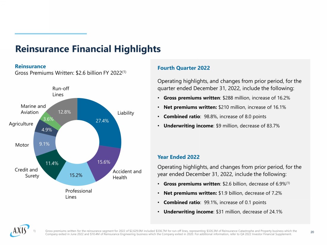 19 Reinsurance Overview 1) The Company exited Reinsurance Catastrophe and Property business in June 2022 and will substantially complete this exit in 20 23. Advancing efforts to reduce earnings volatility and grow a stronger book of business • Ongoing commitment to continuous portfolio management – demonstrated by current year ex - cat loss ratio of 67.3%, essentially flat from 2021 • Expect mid 60%s AY loss ratio going forward following exit from Catastrophe and Property (1) Strong team in place to navigate evolving market conditions • Good 1.1 renewal period which speaks to the strength of our customer relationships and the value that we bring to the market Refocused as specialty reinsurer • Exited from Catastrophe and Property lines to further reduce volatility leading to a decrease in topline gross premiums written • Concentrated growth across profitable lines of business: Casualty, Specialty, A&H, and Credit In 2022 AXIS Re completed a multi - year transformation to reposition itself as a resilient specialty reinsurance business