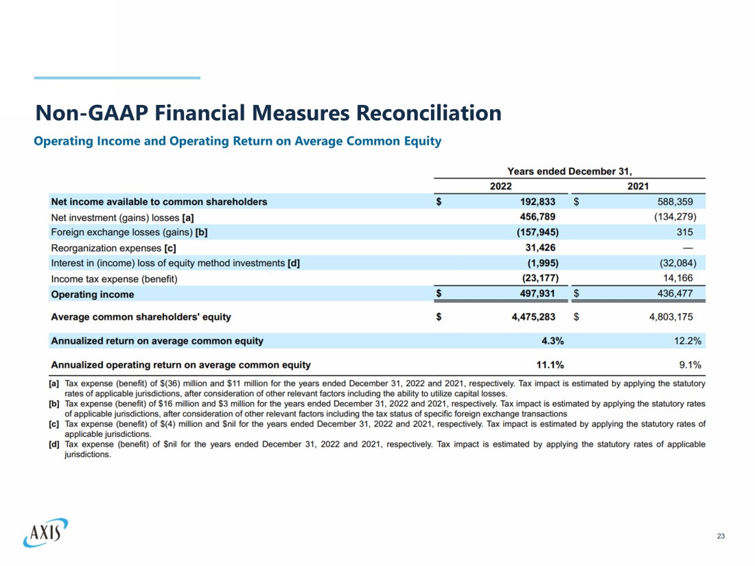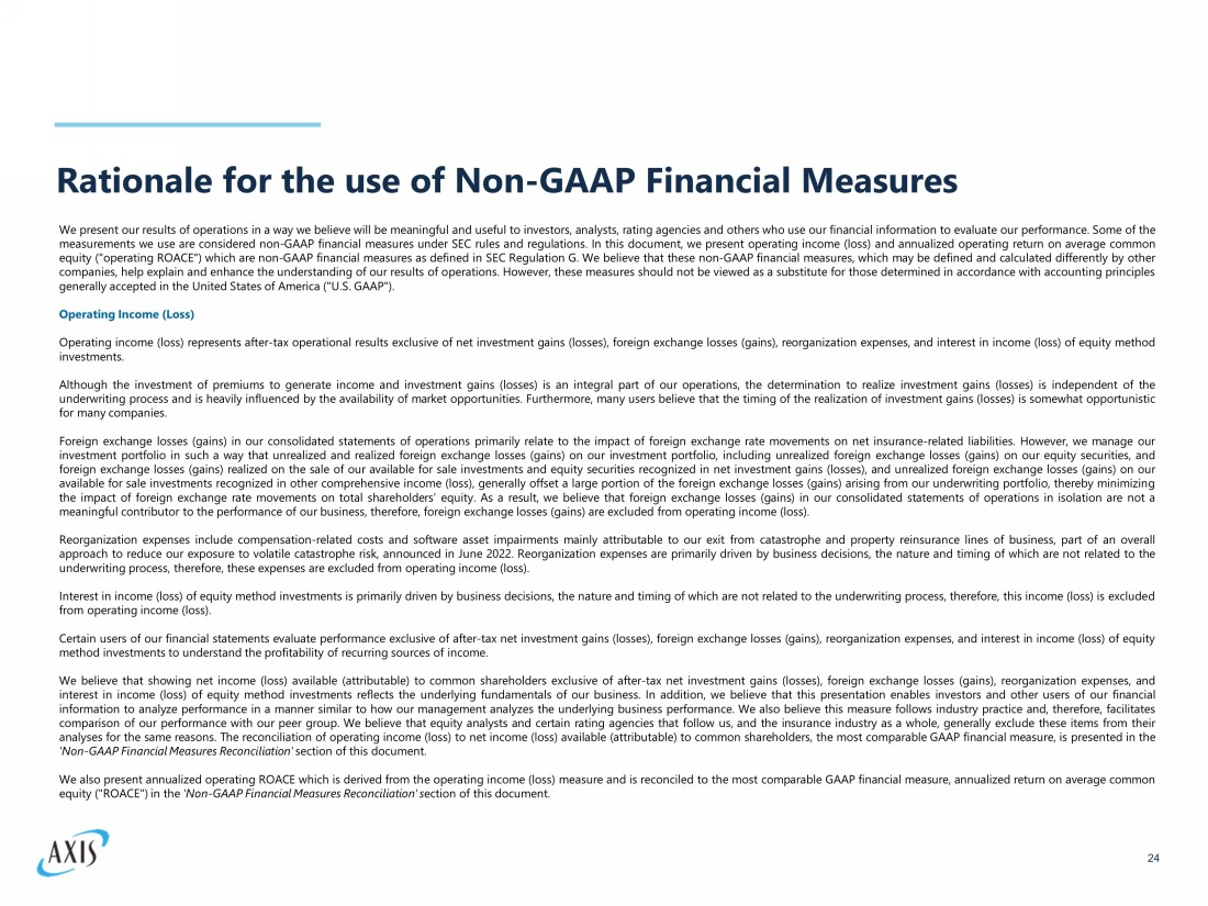 Rationale for the use of Non - GAAP Financial Measures We present our results of operations in a way we believe will be meaningful and useful to investors, analysts, rating agencies and others who use our financial information to evaluate our performance . Some of the measurements we use are considered non - GAAP financial measures under SEC rules and regulations . In this document, we present operating income (loss) and annualized operating return on average common equity ("operating ROACE ") which are non - GAAP financial measures as defined in SEC Regulation G . We believe that these non - GAAP financial measures, which may be defined and calculated differently by other companies, help explain and enhance the understanding of our results of operations . However, these measures should not be viewed as a substitute for those determined in accordance with accounting principles generally accepted in the United States of America ("U . S . GAAP") . Operating Income (Loss) Operating income (loss) represents after - tax operational results exclusive of net investment gains (losses), foreign exchange losses (gains), reorganization expenses, and interest in income (loss) of equity method investments . Although the investment of premiums to generate income and investment gains (losses) is an integral part of our operations, the determination to realize investment gains (losses) is independent of the underwriting process and is heavily influenced by the availability of market opportunities . Furthermore, many users believe that the timing of the realization of investment gains (losses) is somewhat opportunistic for many companies . Foreign exchange losses (gains) in our consolidated statements of operations primarily relate to the impact of foreign exchange rate movements on net insurance - related liabilities . However, we manage our investment portfolio in such a way that unrealized and realized foreign exchange losses (gains) on our investment portfolio, including unrealized foreign exchange losses (gains) on our equity securities, and foreign exchange losses (gains) realized on the sale of our available for sale investments and equity securities recognized in net investment gains (losses), and unrealized foreign exchange losses (gains) on our available for sale investments recognized in other comprehensive income (loss), generally offset a large portion of the foreign exchange losses (gains) arising from our underwriting portfolio, thereby minimizing the impact of foreign exchange rate movements on total shareholders’ equity . As a result, we believe that foreign exchange losses (gains) in our consolidated statements of operations in isolation are not a meaningful contributor to the performance of our business, therefore, foreign exchange losses (gains) are excluded from operating income (loss) . Reorganization expenses include compensation - related costs and software asset impairments mainly attributable to our exit from catastrophe and property reinsurance lines of business, part of an overall approach to reduce our exposure to volatile catastrophe risk, announced in June 2022 . Reorganization expenses are primarily driven by business decisions, the nature and timing of which are not related to the underwriting process, therefore, these expenses are excluded from operating income (loss) . Interest in income (loss) of equity method investments is primarily driven by business decisions, the nature and timing of which are not related to the underwriting process, therefore, this income (loss) is excluded from operating income (loss) . Certain users of our financial statements evaluate performance exclusive of after - tax net investment gains (losses), foreign exchange losses (gains), reorganization expenses, and interest in income (loss) of equity method investments to understand the profitability of recurring sources of income . We believe that showing net income (loss) available (attributable) to common shareholders exclusive of after - tax net investment gains (losses), foreign exchange losses (gains), reorganization expenses, and interest in income (loss) of equity method investments reflects the underlying fundamentals of our business . In addition, we believe that this presentation enables investors and other users of our financial information to analyze performance in a manner similar to how our management analyzes the underlying business performance . We also believe this measure follows industry practice and, therefore, facilitates comparison of our performance with our peer group . We believe that equity analysts and certain rating agencies that follow us, and the insurance industry as a whole, generally exclude these items from their analyses for the same reasons . The reconciliation of operating income (loss) to net income (loss) available (attributable) to common shareholders, the most comparable GAAP financial measure, is presented in the 'Non - GAAP Financial Measures Reconciliation' section of this document . We also present annualized operating ROACE which is derived from the operating income (loss) measure and is reconciled to the most comparable GAAP financial measure, annualized return on average common equity (" ROACE ") in the 'Non - GAAP Financial Measures Reconciliation' s ection of this document . 24