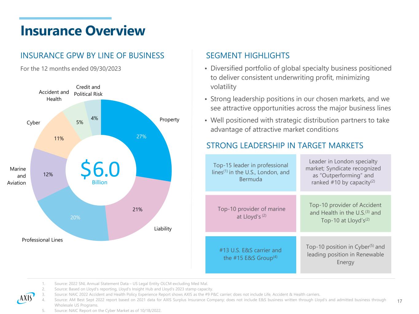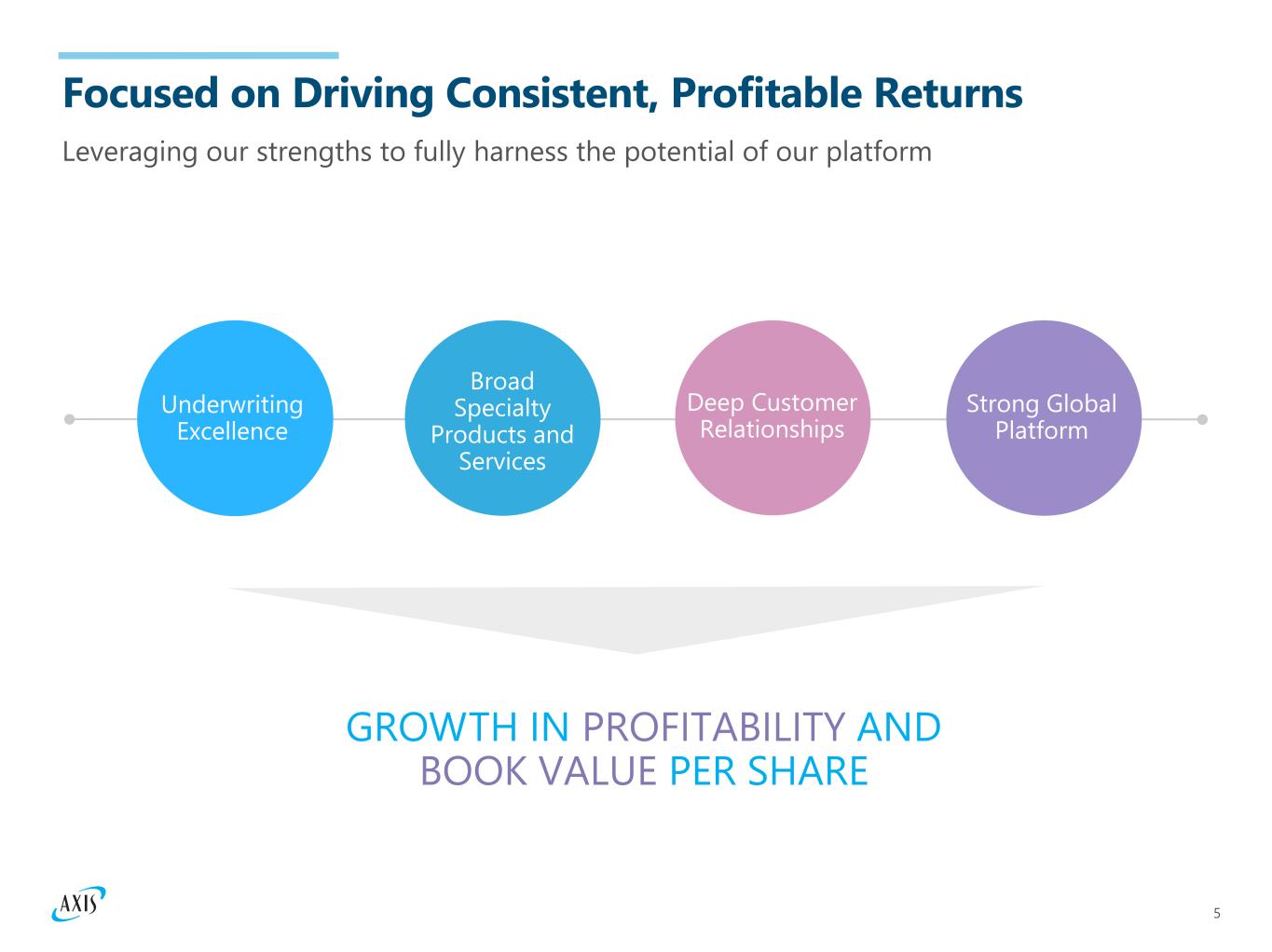 4 72% 28%$4.9 Mix of Business by GPW(3) Insurance $6.0 $8.3 Billion Market Capitalization(1) 15.4% Annualized YTD ROACE 18.4% Annualized YTD Operating ROACE(2) 2003 “AXS” Shares Listed on the New York Stock Exchange Since 20 Represented in 2000+ Employees $16.1 Cash & Investments(4) A/A+ Financial Strength Rating(5) With Stable Outlook Reinsurance $2.3 $29.5 Total Assets Billion Billion $0.44/3.1% Current Quarterly Dividend(1) Billion Billion And Annual Yield(1) Offices Worldwide Note: ROACE, Operating ROACE are presented year to date (YTD), Cash & Investments, Total Assets and number of offices are as of 09/30/2023. 1) Market data per S&P Capital IQ as of 10/31/2023. Q3 $0.44 quarterly dividend paid 10/18/2023. 2) Annualized operating return on average common equity (“Operating ROACE”) is a non-GAAP financial measure as defined in SEC Regulation G. The reconciliation to the most comparable GAAP financial measure ROACE, and a discussion of the rationale for its presentation are provided in the appendix. 3) Gross Premiums Written (“GPW”) are for the twelve months ended Q3 2023. 4) Total cash and invested assets represents the total cash and cash equivalents, fixed maturities, equity securities, mortgage loans, other investments, equity method investments, short-term investments, accrued interest receivable and net receivable (payable) for investments sold (purchased) as of September 30, 2023. 5) Ratings of insurance and reinsurance subsidiaries of AXIS Capital Holdings Limited. S&P Financial Strength Rating (FSR) of A+ and A.M. Best FSR of A. AXIS at a Glance Billion Delivering on our strategy to elevate AXIS as a Specialty Underwriting Leader