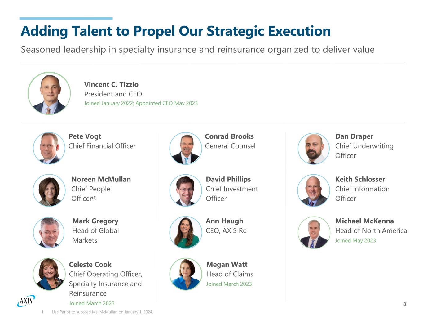 7 Efficiency and Productivity ✓ Simplifying the operating structure to take advantage of market dynamics allowing for quicker decision-making and increased connectivity ✓ Advancing underwriting and performance-oriented mindsets within AXIS ✓ Focusing on improving efficiencies and monetizing our productivity gains ✓ Leveraging our data and digital capabilities, enabling quicker decision-making AREAS OF FOCUS SELECT INITIATIVES Taking a Fresh Look Actions underway to drive performance excellence and further enhance how we operate and go to market Efficiency and Productivity Agility and Speed to Market Technological, Digital and Analytic Capabilities
