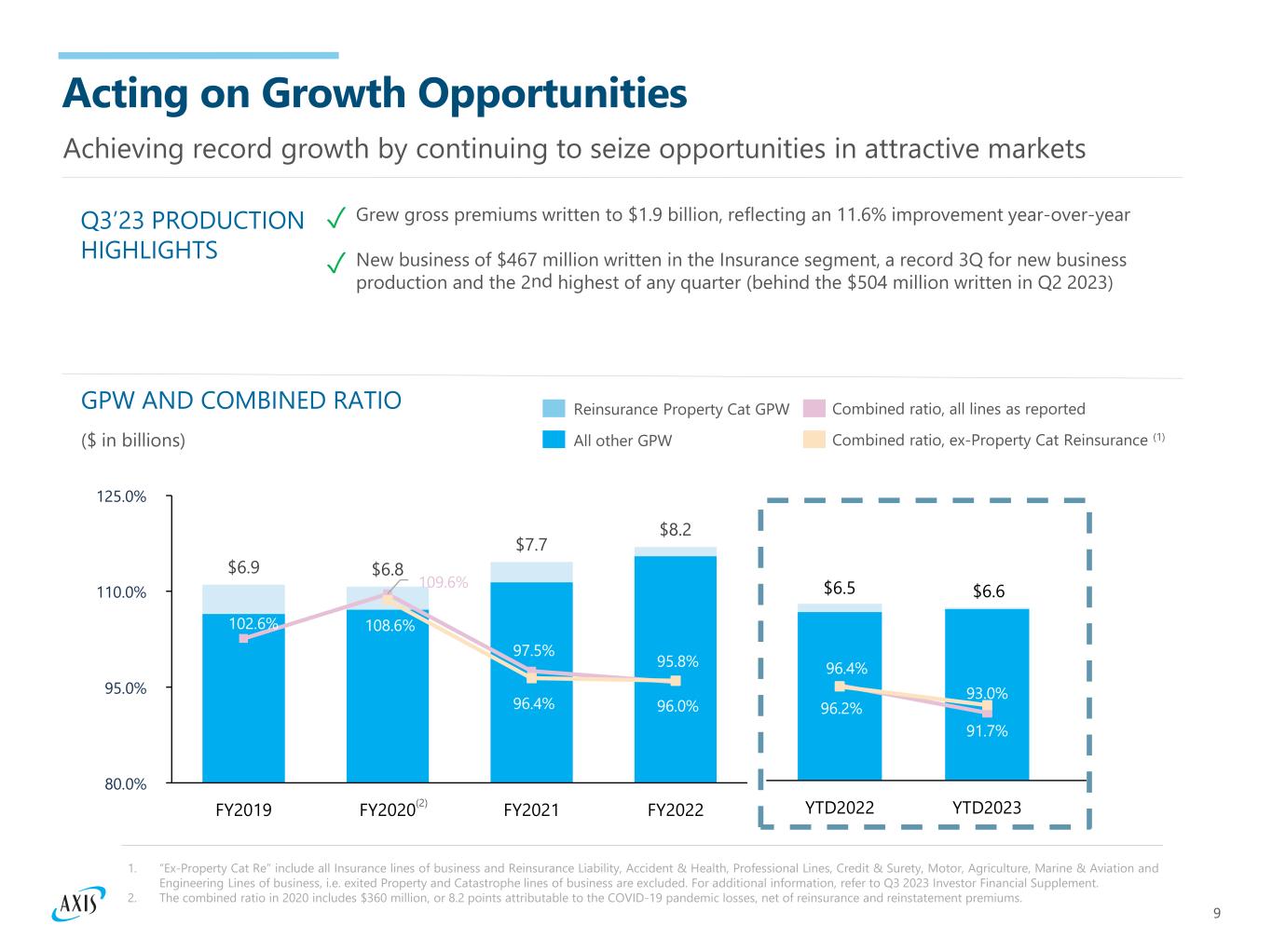 8 Conrad Brooks General Counsel Adding Talent to Propel Our Strategic Execution Seasoned leadership in specialty insurance and reinsurance organized to deliver value Pete Vogt Chief Financial Officer Michael McKenna Head of North America Joined May 2023 Celeste Cook Chief Operating Officer, Specialty Insurance and Reinsurance Joined March 2023 Dan Draper Chief Underwriting Officer Mark Gregory Head of Global Markets Megan Watt Head of Claims Joined March 2023 Noreen McMullan Chief People Officer(1) David Phillips Chief Investment Officer Ann Haugh CEO, AXIS Re Keith Schlosser Chief Information Officer Vincent C. Tizzio President and CEO Joined January 2022; Appointed CEO May 2023 1. Lisa Pariot to succeed Ms. McMullan on January 1, 2024.
