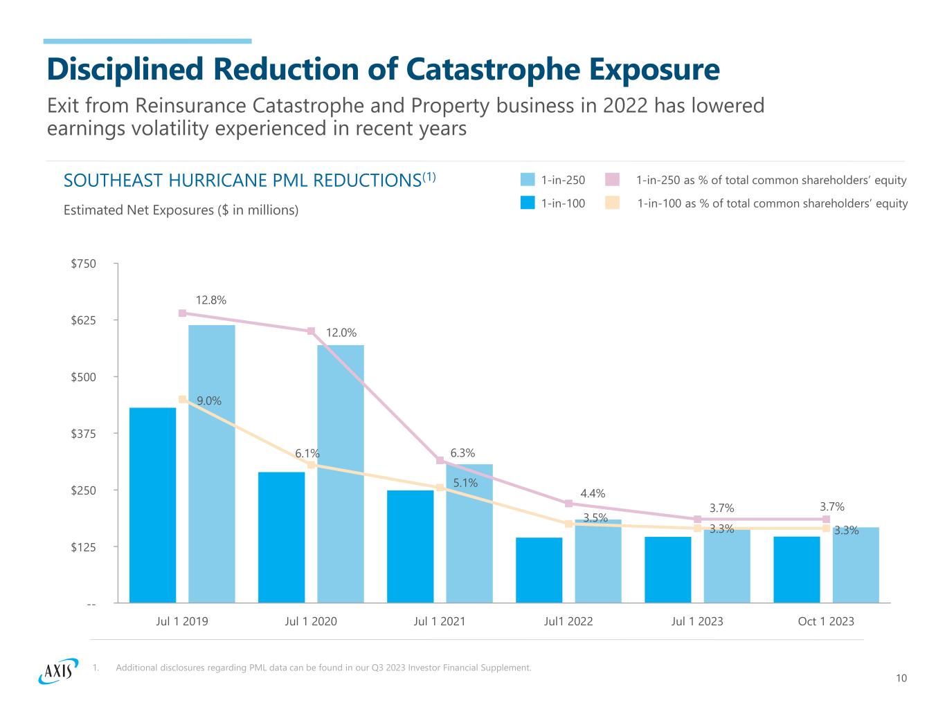 9 $6.5 $6.6 96.4% 91.7% 96.2% 93.0% YTD2022 YTD2023 GPW AND COMBINED RATIO ($ in billions) Combined ratio, all lines as reported Combined ratio, ex-Property Cat Reinsurance (1) Reinsurance Property Cat GPW All other GPW ✓ Grew gross premiums written to $1.9 billion, reflecting an 11.6% improvement year-over-year ✓ New business of $467 million written in the Insurance segment, a record 3Q for new business production and the 2nd highest of any quarter (behind the $504 million written in Q2 2023) Q3’23 PRODUCTION HIGHLIGHTS Acting on Growth Opportunities Achieving record growth by continuing to seize opportunities in attractive markets 1. “Ex-Property Cat Re” include all Insurance lines of business and Reinsurance Liability, Accident & Health, Professional Lines, Credit & Surety, Motor, Agriculture, Marine & Aviation and Engineering Lines of business, i.e. exited Property and Catastrophe lines of business are excluded. For additional information, refer to Q3 2023 Investor Financial Supplement. 2. The combined ratio in 2020 includes $360 million, or 8.2 points attributable to the COVID-19 pandemic losses, net of reinsurance and reinstatement premiums. (2) $6.9 $6.8 $7.7 $8.2 102.6% 109.6% 97.5% 95.8% 108.6% 96.4% 96.0% 80.0% 95.0% 110.0% 125.0% FY2019 FY2020 FY2021 FY2022