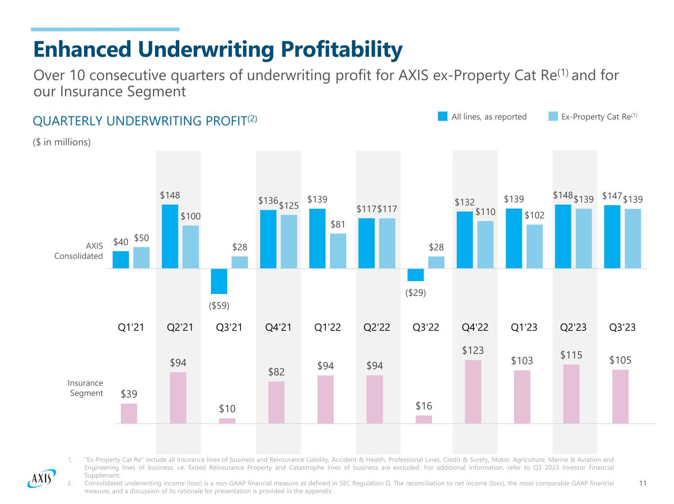 10 9.0% 6.1% 5.1% 3.5% 3.3% 3.3% 12.8% 12.0% 6.3% 4.4% 3.7% 3.7% -- $125 $250 $375 $500 $625 $750 Jul 1 2019 Jul 1 2020 Jul 1 2021 Jul1 2022 Jul 1 2023 Oct 1 2023 Disciplined Reduction of Catastrophe Exposure Exit from Reinsurance Catastrophe and Property business in 2022 has lowered earnings volatility experienced in recent years 1-in-250 as % of total common shareholders’ equity 1-in-100 as % of total common shareholders’ equity 1-in-250 1-in-100 SOUTHEAST HURRICANE PML REDUCTIONS(1) Estimated Net Exposures ($ in millions) 1. Additional disclosures regarding PML data can be found in our Q3 2023 Investor Financial Supplement.