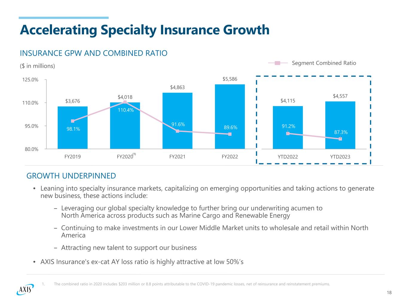 17 Property Liability Professional Lines Marine and Aviation Cyber Accident and Health Credit and Political Risk 27% 21% 20% 12% 11% 5% 4% Insurance Overview 1. Source: 2022 SNL Annual Statement Data – US Legal Entity OLCM excluding Med Mal. 2. Source: Based on Lloyd's reporting, Lloyd's Insight Hub and Lloyd's 2023 stamp capacity. 3. Source: NAIC 2022 Accident and Health Policy Experience Report shows AXIS as the #9 P&C carrier; does not include Life, Accident & Health carriers. 4. Source: AM Best Sept 2022 report based on 2021 data for AXIS Surplus Insurance Company; does not include E&S business written through Lloyd’s and admitted business through Wholesale US Programs. 5. Source: NAIC Report on the Cyber Market as of 10/18/2022. SEGMENT HIGHLIGHTS STRONG LEADERSHIP IN TARGET MARKETS Top-15 leader in professional lines(1) in the U.S., London, and Bermuda Top-10 provider of marine at Lloyd's (2) Leader in London specialty market; Syndicate recognized as “Outperforming” and ranked #10 by capacity(2) Top-10 provider of Accident and Health in the U.S.(3) and Top-10 at Lloyd’s(2) #13 U.S. E&S carrier and the #15 E&S Group(4) Top-10 position in Cyber(5) and leading position in Renewable Energy $6.0 Billion INSURANCE GPW BY LINE OF BUSINESS For the 12 months ended 09/30/2023 • Diversified portfolio of global specialty business positioned to deliver consistent underwriting profit, minimizing volatility • Strong leadership positions in our chosen markets, and we see attractive opportunities across the major business lines • Well positioned with strategic distribution partners to take advantage of attractive market conditions