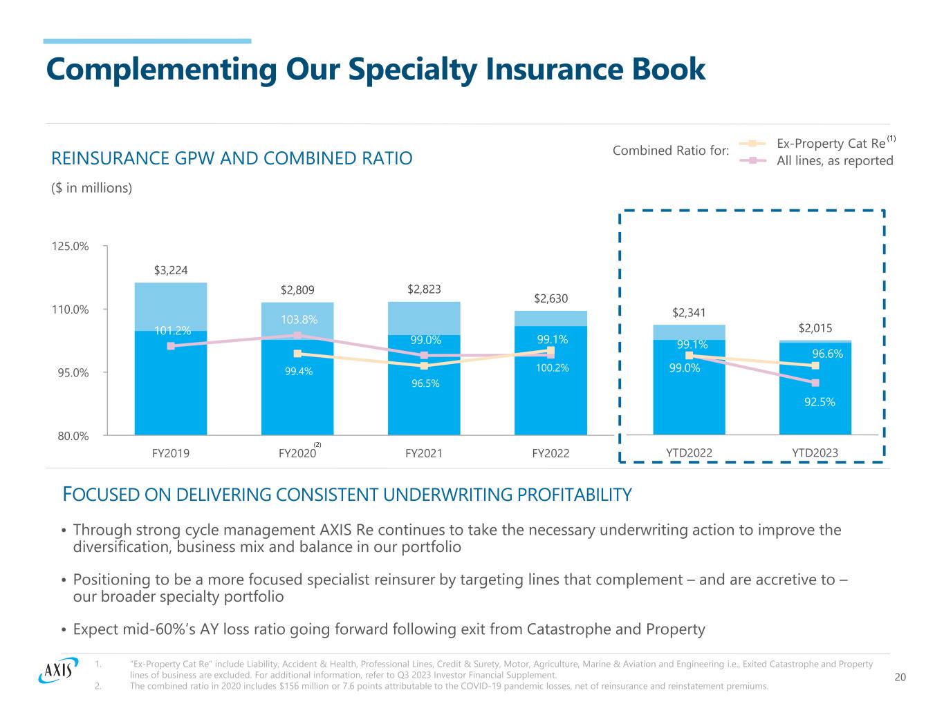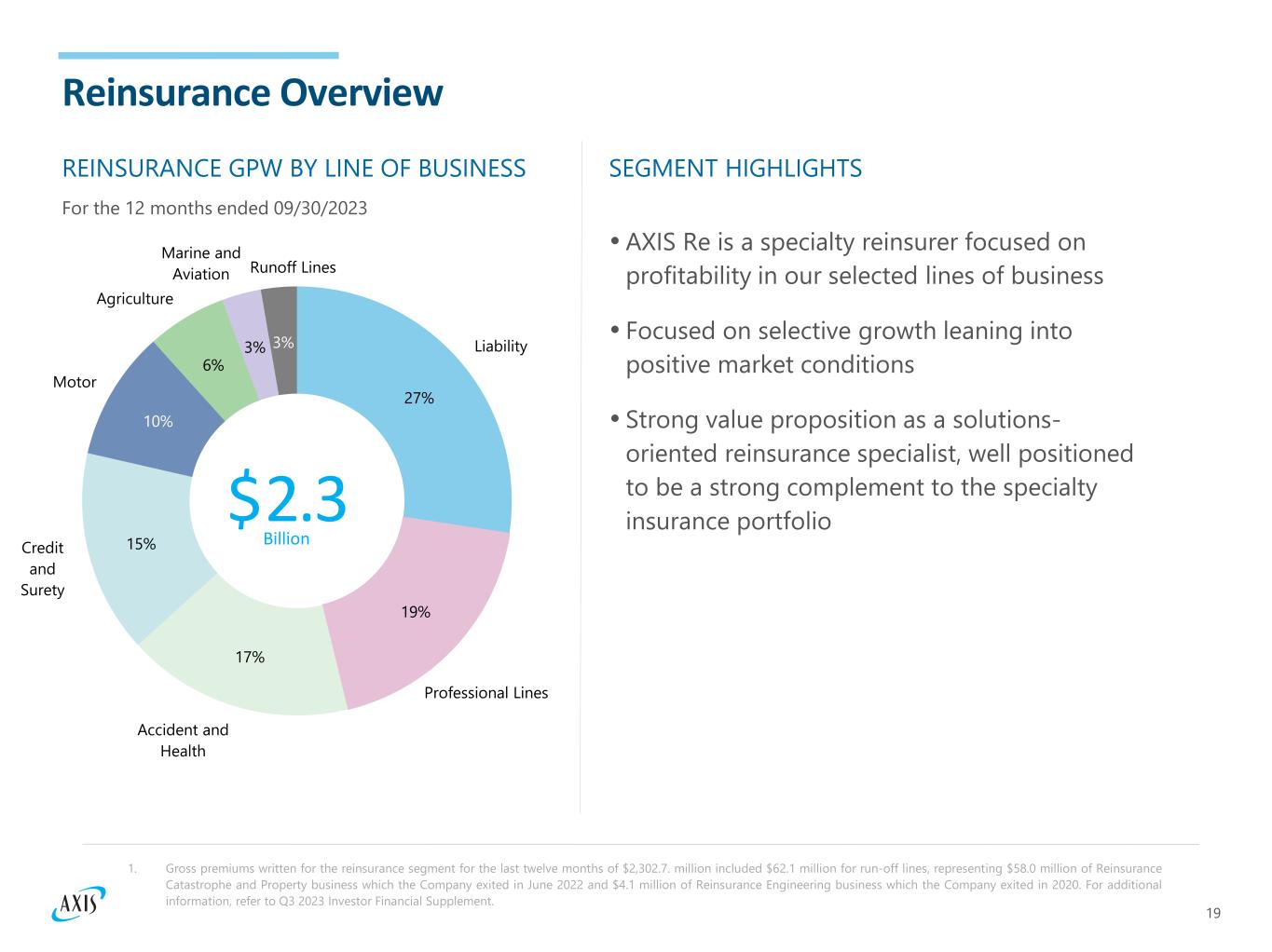 18 $4,115 $4,557 91.2% 87.3% YTD2022 YTD2023 $3,676 $4,018 $4,863 $5,586 98.1% 110.4% 91.6% 89.6% 80.0% 95.0% 110.0% 125.0% FY2019 FY2020 FY2021 FY2022 Segment Combined Ratio Accelerating Specialty Insurance Growth (1) INSURANCE GPW AND COMBINED RATIO ($ in millions) 1. The combined ratio in 2020 includes $203 million or 8.8 points attributable to the COVID-19 pandemic losses, net of reinsurance and reinstatement premiums. • Leaning into specialty insurance markets, capitalizing on emerging opportunities and taking actions to generate new business, these actions include: - Leveraging our global specialty knowledge to further bring our underwriting acumen to North America across products such as Marine Cargo and Renewable Energy - Continuing to make investments in our Lower Middle Market units to wholesale and retail within North America - Attracting new talent to support our business • AXIS Insurance's ex-cat AY loss ratio is highly attractive at low 50%’s GROWTH UNDERPINNED