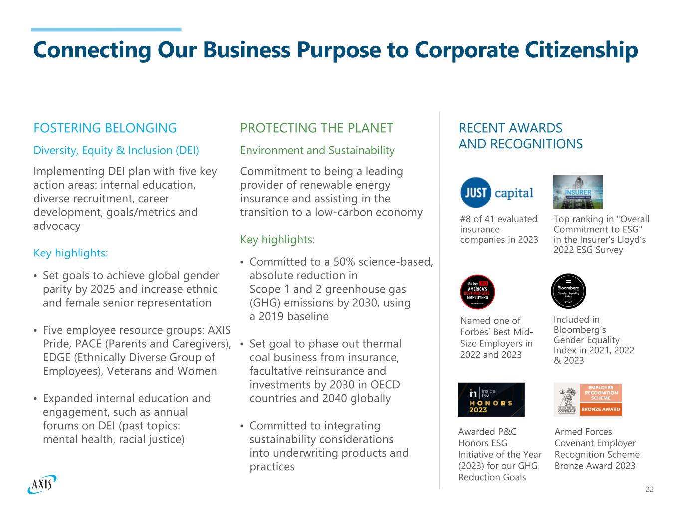 22 Connecting Our Business Purpose to Corporate Citizenship Implementing DEI plan with five key action areas: internal education, diverse recruitment, career development, goals/metrics and advocacy Key highlights: • Set goals to achieve global gender parity by 2025 and increase ethnic and female senior representation • Five employee resource groups: AXIS Pride, PACE (Parents and Caregivers), EDGE (Ethnically Diverse Group of Employees), Veterans and Women • Expanded internal education and engagement, such as annual forums on DEI (past topics: mental health, racial justice) FOSTERING BELONGING Diversity, Equity & Inclusion (DEI) Commitment to being a leading provider of renewable energy insurance and assisting in the transition to a low-carbon economy Key highlights: • Committed to a 50% science-based, absolute reduction in Scope 1 and 2 greenhouse gas (GHG) emissions by 2030, using a 2019 baseline • Set goal to phase out thermal coal business from insurance, facultative reinsurance and investments by 2030 in OECD countries and 2040 globally • Committed to integrating sustainability considerations into underwriting products and practices PROTECTING THE PLANET Environment and Sustainability RECENT AWARDS AND RECOGNITIONS Armed Forces Covenant Employer Recognition Scheme Bronze Award 2023 Awarded P&C Honors ESG Initiative of the Year (2023) for our GHG Reduction Goals #8 of 41 evaluated insurance companies in 2023 Top ranking in "Overall Commitment to ESG" in the Insurer's Lloyd’s 2022 ESG Survey Included in Bloomberg’s Gender Equality Index in 2021, 2022 & 2023 Named one of Forbes’ Best Mid- Size Employers in 2022 and 2023