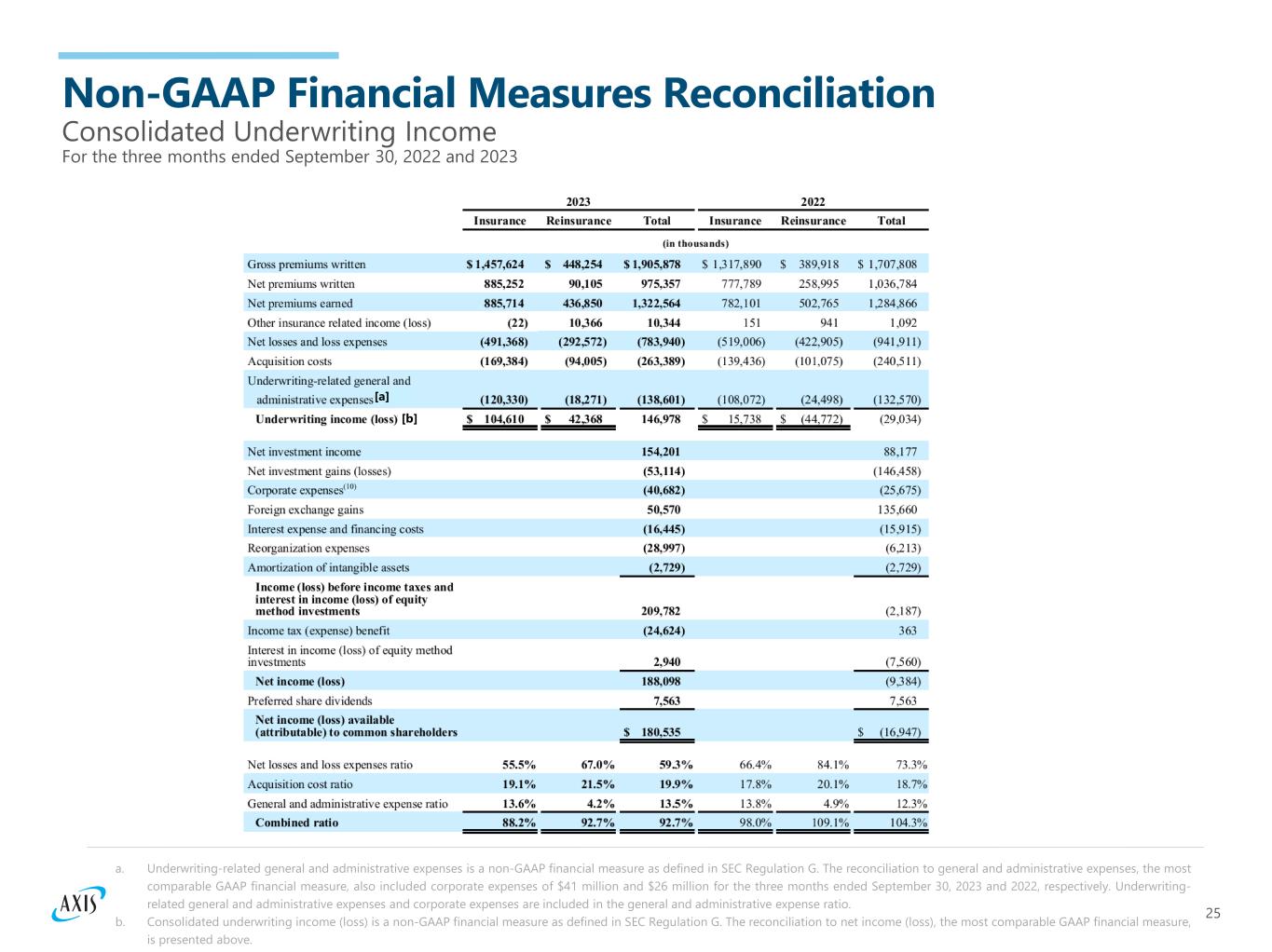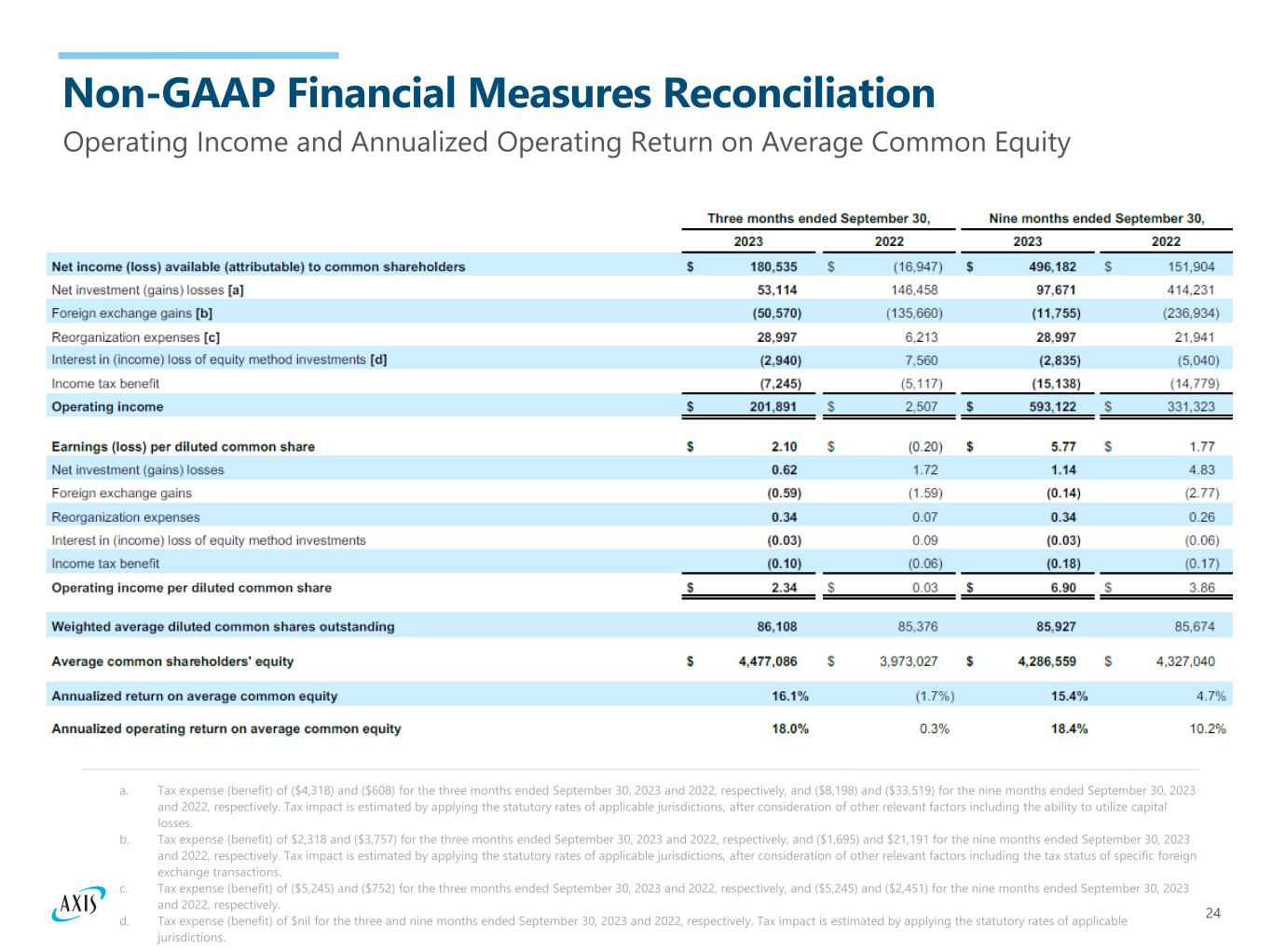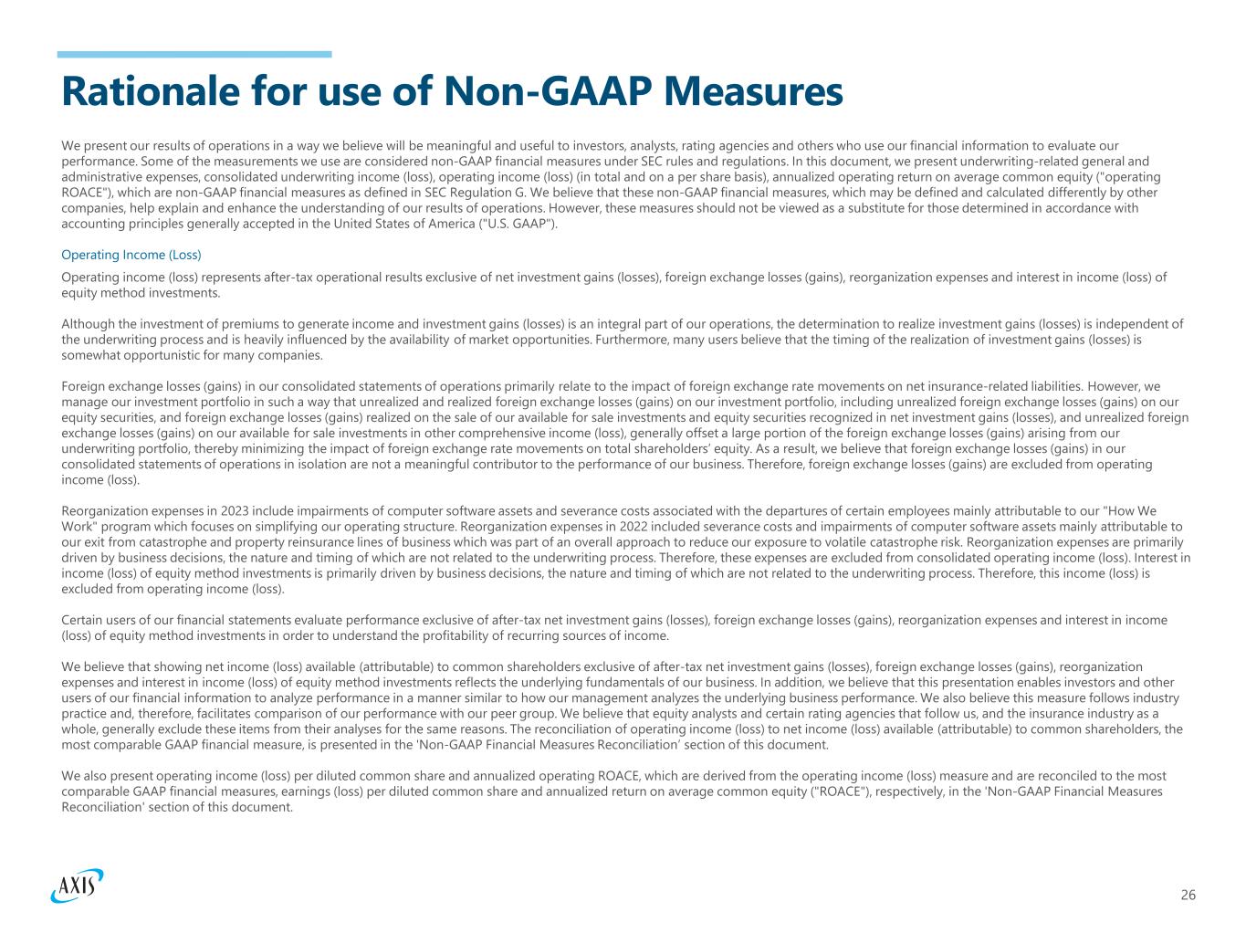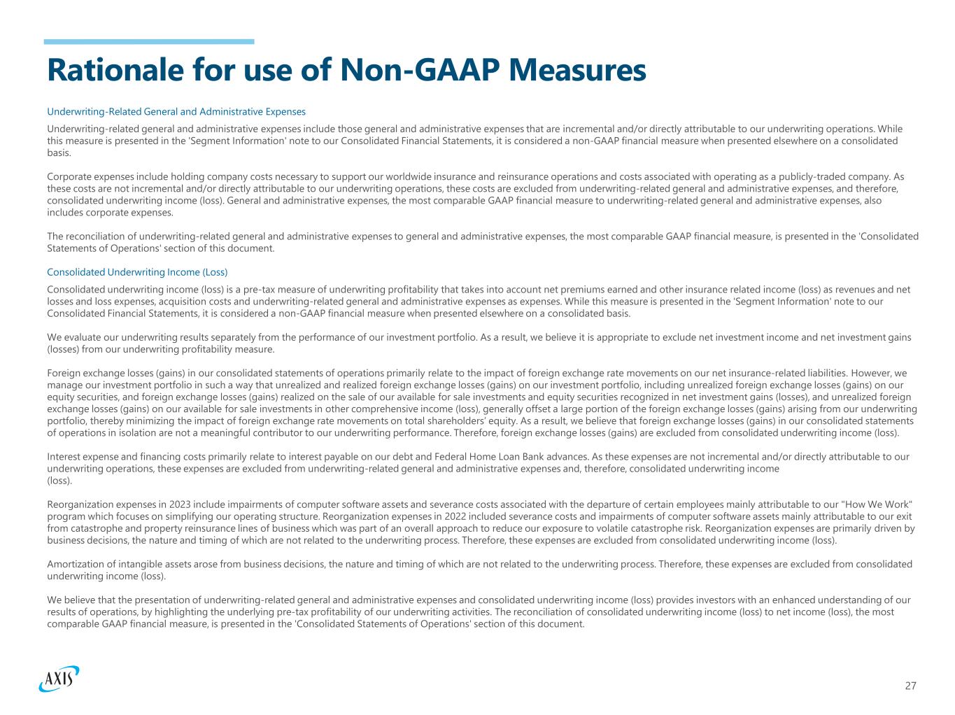 26 Rationale for use of Non-GAAP Measures We present our results of operations in a way we believe will be meaningful and useful to investors, analysts, rating agencies and others who use our financial information to evaluate our performance. Some of the measurements we use are considered non-GAAP financial measures under SEC rules and regulations. In this document, we present underwriting-related general and administrative expenses, consolidated underwriting income (loss), operating income (loss) (in total and on a per share basis), annualized operating return on average common equity ("operating ROACE"), which are non-GAAP financial measures as defined in SEC Regulation G. We believe that these non-GAAP financial measures, which may be defined and calculated differently by other companies, help explain and enhance the understanding of our results of operations. However, these measures should not be viewed as a substitute for those determined in accordance with accounting principles generally accepted in the United States of America ("U.S. GAAP"). Operating Income (Loss) Operating income (loss) represents after-tax operational results exclusive of net investment gains (losses), foreign exchange losses (gains), reorganization expenses and interest in income (loss) of equity method investments. Although the investment of premiums to generate income and investment gains (losses) is an integral part of our operations, the determination to realize investment gains (losses) is independent of the underwriting process and is heavily influenced by the availability of market opportunities. Furthermore, many users believe that the timing of the realization of investment gains (losses) is somewhat opportunistic for many companies. Foreign exchange losses (gains) in our consolidated statements of operations primarily relate to the impact of foreign exchange rate movements on net insurance-related liabilities. However, we manage our investment portfolio in such a way that unrealized and realized foreign exchange losses (gains) on our investment portfolio, including unrealized foreign exchange losses (gains) on our equity securities, and foreign exchange losses (gains) realized on the sale of our available for sale investments and equity securities recognized in net investment gains (losses), and unrealized foreign exchange losses (gains) on our available for sale investments in other comprehensive income (loss), generally offset a large portion of the foreign exchange losses (gains) arising from our underwriting portfolio, thereby minimizing the impact of foreign exchange rate movements on total shareholders’ equity. As a result, we believe that foreign exchange losses (gains) in our consolidated statements of operations in isolation are not a meaningful contributor to the performance of our business. Therefore, foreign exchange losses (gains) are excluded from operating income (loss). Reorganization expenses in 2023 include impairments of computer software assets and severance costs associated with the departures of certain employees mainly attributable to our "How We Work" program which focuses on simplifying our operating structure. Reorganization expenses in 2022 included severance costs and impairments of computer software assets mainly attributable to our exit from catastrophe and property reinsurance lines of business which was part of an overall approach to reduce our exposure to volatile catastrophe risk. Reorganization expenses are primarily driven by business decisions, the nature and timing of which are not related to the underwriting process. Therefore, these expenses are excluded from consolidated operating income (loss). Interest in income (loss) of equity method investments is primarily driven by business decisions, the nature and timing of which are not related to the underwriting process. Therefore, this income (loss) is excluded from operating income (loss). Certain users of our financial statements evaluate performance exclusive of after-tax net investment gains (losses), foreign exchange losses (gains), reorganization expenses and interest in income (loss) of equity method investments in order to understand the profitability of recurring sources of income. We believe that showing net income (loss) available (attributable) to common shareholders exclusive of after-tax net investment gains (losses), foreign exchange losses (gains), reorganization expenses and interest in income (loss) of equity method investments reflects the underlying fundamentals of our business. In addition, we believe that this presentation enables investors and other users of our financial information to analyze performance in a manner similar to how our management analyzes the underlying business performance. We also believe this measure follows industry practice and, therefore, facilitates comparison of our performance with our peer group. We believe that equity analysts and certain rating agencies that follow us, and the insurance industry as a whole, generally exclude these items from their analyses for the same reasons. The reconciliation of operating income (loss) to net income (loss) available (attributable) to common shareholders, the most comparable GAAP financial measure, is presented in the 'Non-GAAP Financial Measures Reconciliation’ section of this document. We also present operating income (loss) per diluted common share and annualized operating ROACE, which are derived from the operating income (loss) measure and are reconciled to the most comparable GAAP financial measures, earnings (loss) per diluted common share and annualized return on average common equity ("ROACE"), respectively, in the 'Non-GAAP Financial Measures Reconciliation' section of this document.