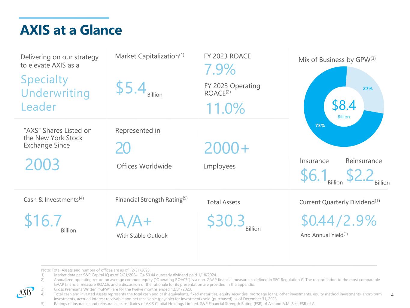 4 73% 27%$5.4 Mix of Business by GPW(3) Insurance $6.1 $8.4 Billion Market Capitalization(1) 7.9% FY 2023 ROACE 11.0% FY 2023 Operating ROACE(2) 2003 “AXS” Shares Listed on the New York Stock Exchange Since 20 Represented in 2000+ Employees $16.7 Cash & Investments(4) A/A+ Financial Strength Rating(5) With Stable Outlook Reinsurance $2.2 $30.3 Total Assets Billion Billion $0.44/2.9% Current Quarterly Dividend(1) Billion Billion And Annual Yield(1) Offices Worldwide Note: Total Assets and number of offices are as of 12/31/2023. 1) Market data per S&P Capital IQ as of 2/21/2024. Q4 $0.44 quarterly dividend paid 1/18/2024. 2) Annualized operating return on average common equity (“Operating ROACE”) is a non-GAAP financial measure as defined in SEC Regulation G. The reconciliation to the most comparable GAAP financial measure ROACE, and a discussion of the rationale for its presentation are provided in the appendix. 3) Gross Premiums Written (“GPW”) are for the twelve months ended 12/31/2023. 4) Total cash and invested assets represents the total cash and cash equivalents, fixed maturities, equity securities, mortgage loans, other investments, equity method investments, short-term investments, accrued interest receivable and net receivable (payable) for investments sold (purchased) as of December 31, 2023. 5) Ratings of insurance and reinsurance subsidiaries of AXIS Capital Holdings Limited. S&P Financial Strength Rating (FSR) of A+ and A.M. Best FSR of A. AXIS at a Glance Billion Delivering on our strategy to elevate AXIS as a Specialty Underwriting Leader