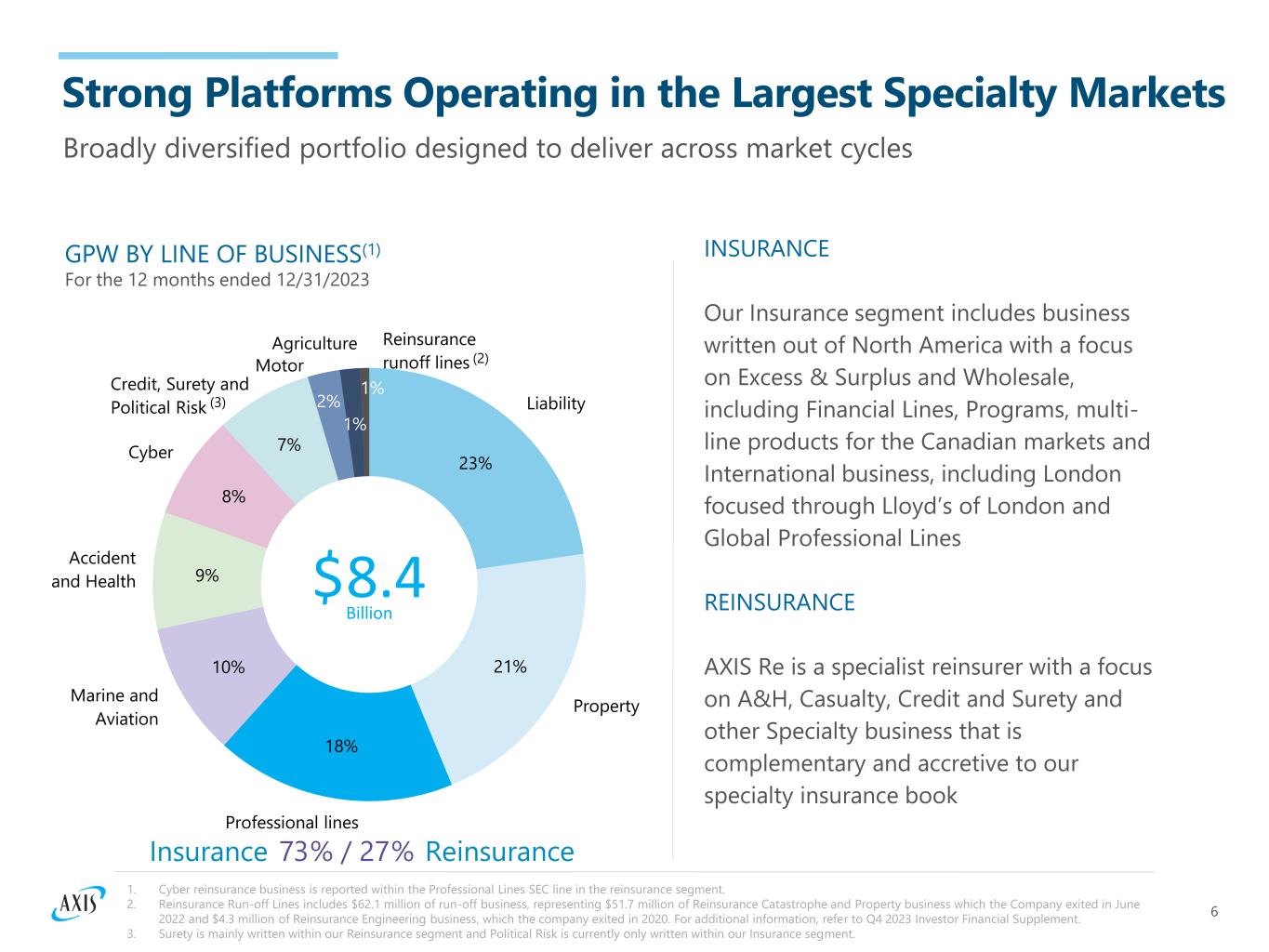 6 Liability Property Professional lines Marine and Aviation Accident and Health Cyber Credit, Surety and Political Risk Motor Agriculture Reinsurance runoff lines 23% 21% 18% 10% 9% 8% 7% 2% 1% 1% Insurance 73% / 27% Reinsurance Strong Platforms Operating in the Largest Specialty Markets Broadly diversified portfolio designed to deliver across market cycles $8.4 Billion 1. Cyber reinsurance business is reported within the Professional Lines SEC line in the reinsurance segment. 2. Reinsurance Run-off Lines includes $62.1 million of run-off business, representing $51.7 million of Reinsurance Catastrophe and Property business which the Company exited in June 2022 and $4.3 million of Reinsurance Engineering business, which the company exited in 2020. For additional information, refer to Q4 2023 Investor Financial Supplement. 3. Surety is mainly written within our Reinsurance segment and Political Risk is currently only written within our Insurance segment. INSURANCE Our Insurance segment includes business written out of North America with a focus on Excess & Surplus and Wholesale, including Financial Lines, Programs, multi- line products for the Canadian markets and International business, including London focused through Lloyd’s of London and Global Professional Lines REINSURANCE AXIS Re is a specialist reinsurer with a focus on A&H, Casualty, Credit and Surety and other Specialty business that is complementary and accretive to our specialty insurance book GPW BY LINE OF BUSINESS(1) For the 12 months ended 12/31/2023 (2) (3)