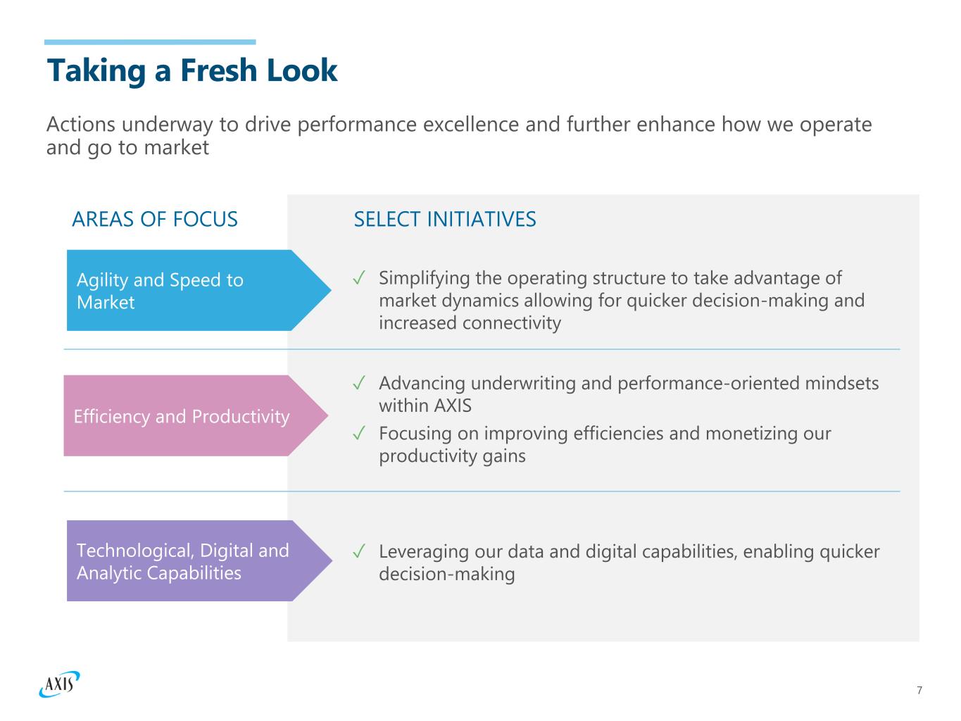 7 Efficiency and Productivity ✓ Simplifying the operating structure to take advantage of market dynamics allowing for quicker decision-making and increased connectivity ✓ Advancing underwriting and performance-oriented mindsets within AXIS ✓ Focusing on improving efficiencies and monetizing our productivity gains ✓ Leveraging our data and digital capabilities, enabling quicker decision-making AREAS OF FOCUS SELECT INITIATIVES Taking a Fresh Look Actions underway to drive performance excellence and further enhance how we operate and go to market Efficiency and Productivity Agility and Speed to Market Technological, Digital and Analytic Capabilities