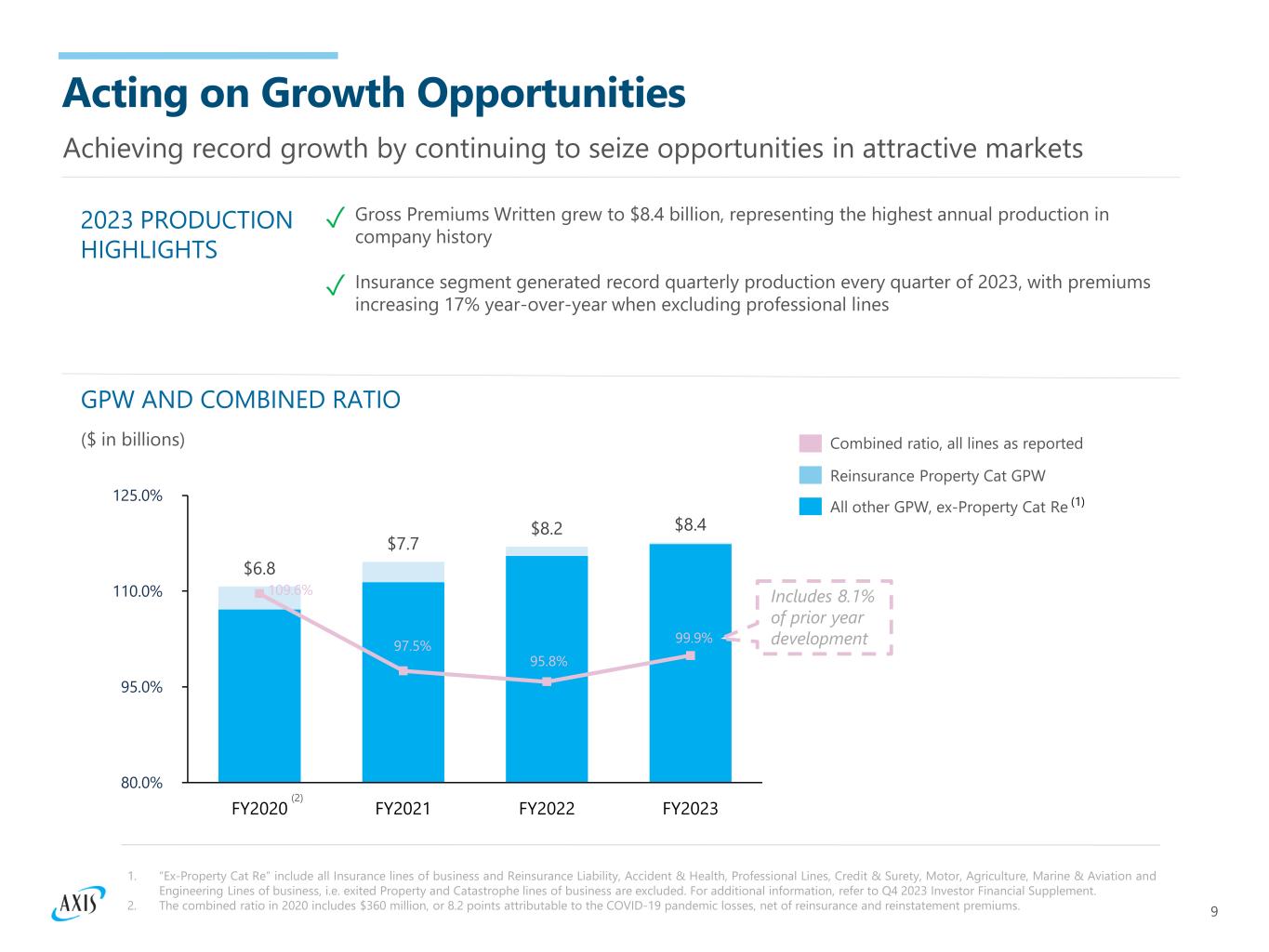 8 Conrad Brooks Chief Legal and Administrative Officer Adding Talent to Propel Our Strategic Execution Seasoned leadership in specialty insurance and reinsurance organized to deliver value Pete Vogt Chief Financial Officer Celeste Cook Chief Operating Officer, Specialty Insurance and Reinsurance Dan Draper Chief Underwriting Officer Mark Gregory Head of Global Markets Megan Watt Head of Claims David Phillips Chief Investment Officer Michael McKenna Head of North America Vincent C. Tizzio President and CEO Joined January 2022; Appointed CEO May 2023 Ann Haugh CEO, AXIS Re