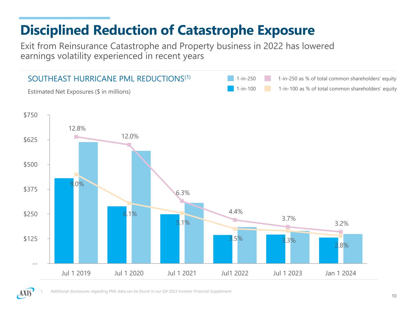 9 GPW AND COMBINED RATIO ($ in billions) Combined ratio, all lines as reported Reinsurance Property Cat GPW All other GPW, ex-Property Cat Re ✓ Gross Premiums Written grew to $8.4 billion, representing the highest annual production in company history ✓ Insurance segment generated record quarterly production every quarter of 2023, with premiums increasing 17% year-over-year when excluding professional lines 2023 PRODUCTION HIGHLIGHTS Acting on Growth Opportunities Achieving record growth by continuing to seize opportunities in attractive markets 1. “Ex-Property Cat Re” include all Insurance lines of business and Reinsurance Liability, Accident & Health, Professional Lines, Credit & Surety, Motor, Agriculture, Marine & Aviation and Engineering Lines of business, i.e. exited Property and Catastrophe lines of business are excluded. For additional information, refer to Q4 2023 Investor Financial Supplement. 2. The combined ratio in 2020 includes $360 million, or 8.2 points attributable to the COVID-19 pandemic losses, net of reinsurance and reinstatement premiums. (2) $6.8 $7.7 $8.2 $8.4 109.6% 97.5% 95.8% 99.9% 80.0% 95.0% 110.0% 125.0% FY2020 FY2021 FY2022 FY2023 (1) Includes 8.1% of prior year development