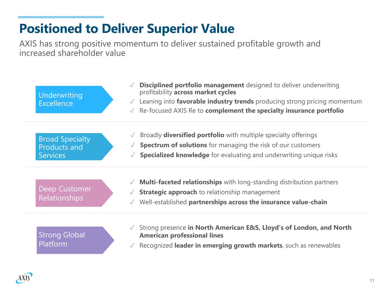 10 Disciplined Reduction of Catastrophe Exposure Exit from Reinsurance Catastrophe and Property business in 2022 has lowered earnings volatility experienced in recent years 1-in-250 as % of total common shareholders’ equity 1-in-100 as % of total common shareholders’ equity 1-in-250 1-in-100 SOUTHEAST HURRICANE PML REDUCTIONS(1) Estimated Net Exposures ($ in millions) 1. Additional disclosures regarding PML data can be found in our Q4 2023 Investor Financial Supplement. 9.0% 6.1% 5.1% 3.5% 3.3% 2.8% 12.8% 12.0% 6.3% 4.4% 3.7% 3.2% -- $125 $250 $375 $500 $625 $750 Jul 1 2019 Jul 1 2020 Jul 1 2021 Jul1 2022 Jul 1 2023 Jan 1 2024