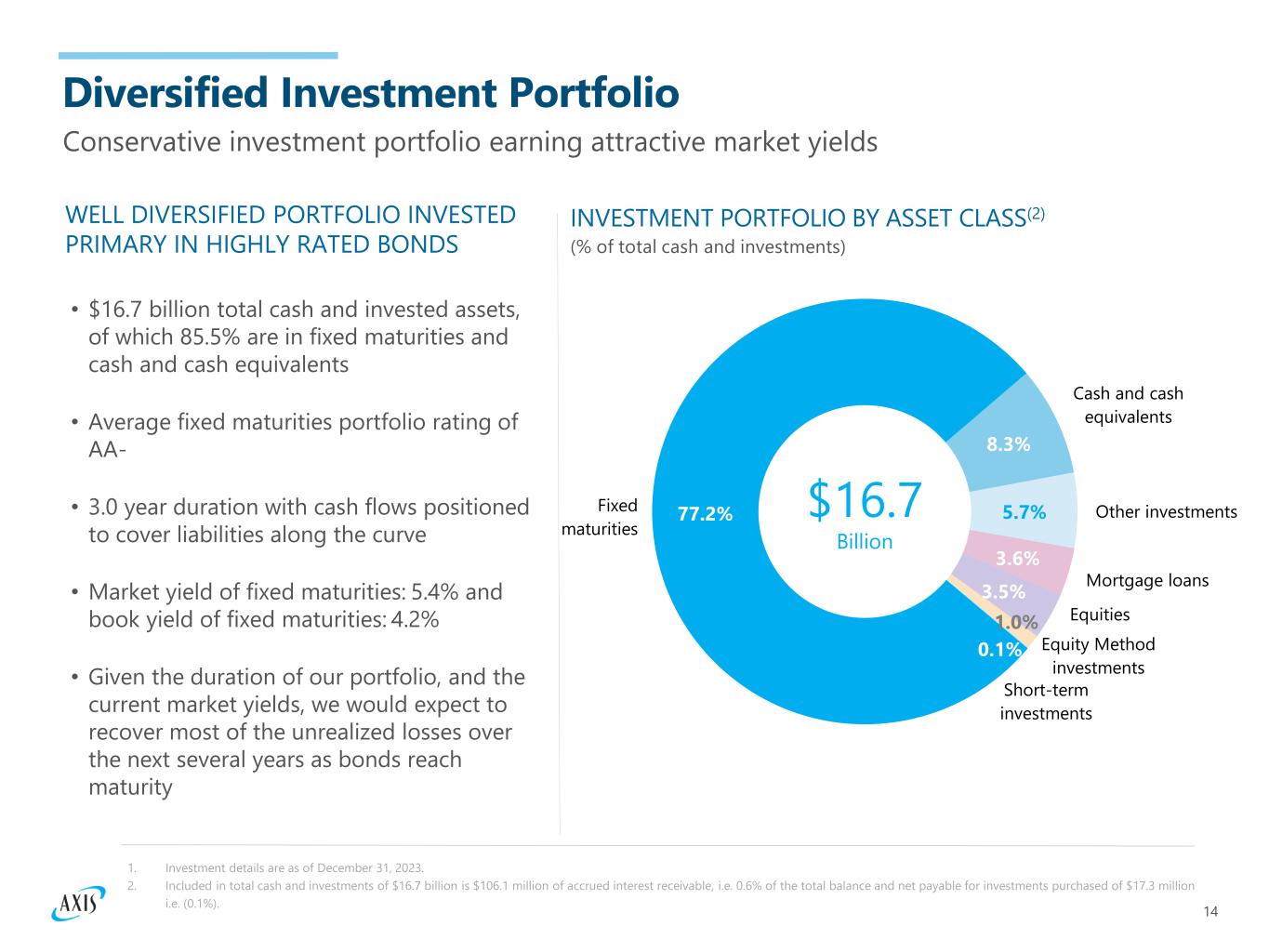 13 • Our top priority is to allocate capital to support profitable growth in our specialty businesses • $153 million in capital returned to shareholders through dividends declared during the twelve months ended December 31, 2023 • $100 million Board-authorized share repurchase capacity through the end of 2024 • Financial leverage ratio(1) 28.3% at December 31, 2023 • Leverage ratio is expected to continue to decrease as mark-to-market adjustments unwind through 2025 DISCIPLINED CAPITAL ALLOCATION Well Capitalized Balance Sheet Main priority for the use of capital today is to support key growth initiatives 1. Financial leverage ratio calculated as debt and preferred equity over the sum of book value of common equity, preferred equity, and debt. Debt excludes FHLB advances of $85.8 million. Q4’23 BRIDGE TO TOTAL CAPITAL ($ in millions) S&P Financial Strength Rating A+ StabA.M. Best Financial Strength Rating A $4,713.2 $6,576.9 $550.0 $1,313.7 Common equity Preferred equity Debt Total capital