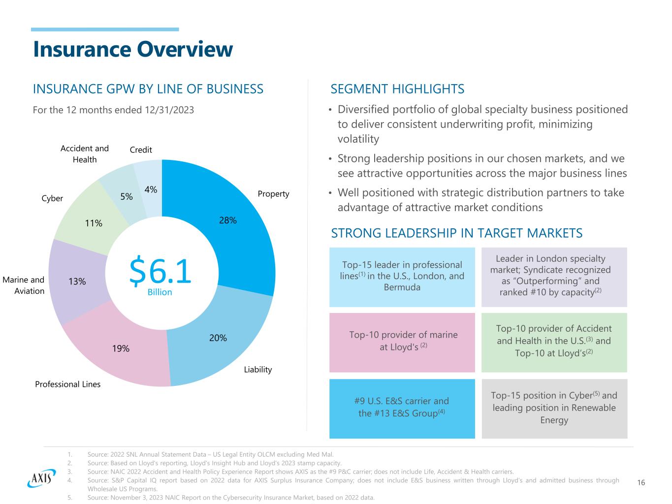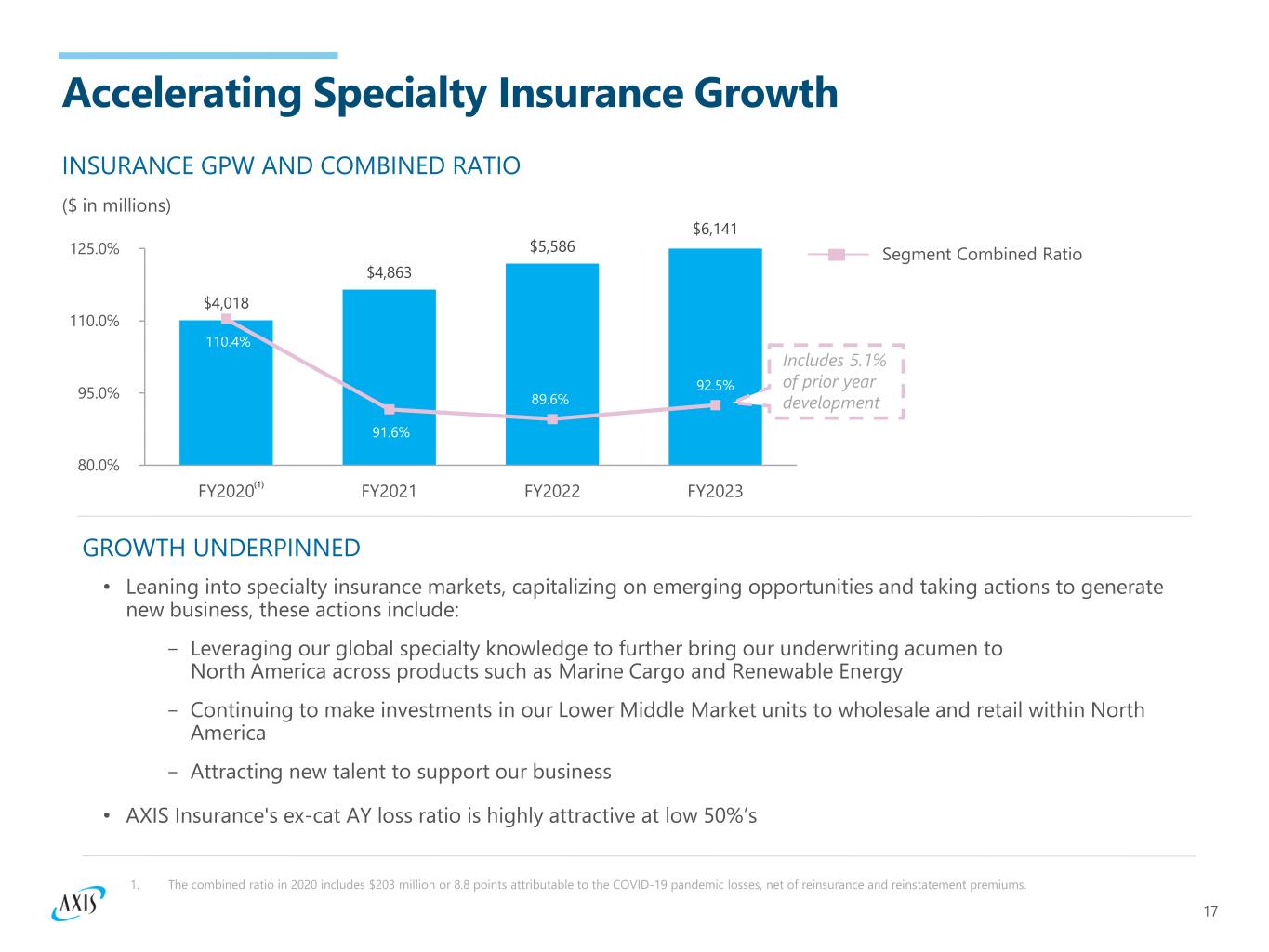 16 Property Liability Professional Lines Marine and Aviation Cyber Accident and Health Credit 28% 20% 19% 13% 11% 5% 4% Insurance Overview 1. Source: 2022 SNL Annual Statement Data – US Legal Entity OLCM excluding Med Mal. 2. Source: Based on Lloyd's reporting, Lloyd's Insight Hub and Lloyd's 2023 stamp capacity. 3. Source: NAIC 2022 Accident and Health Policy Experience Report shows AXIS as the #9 P&C carrier; does not include Life, Accident & Health carriers. 4. Source: S&P Capital IQ report based on 2022 data for AXIS Surplus Insurance Company; does not include E&S business written through Lloyd’s and admitted business through Wholesale US Programs. 5. Source: November 3, 2023 NAIC Report on the Cybersecurity Insurance Market, based on 2022 data. SEGMENT HIGHLIGHTS STRONG LEADERSHIP IN TARGET MARKETS Top-15 leader in professional lines(1) in the U.S., London, and Bermuda Top-10 provider of marine at Lloyd's (2) Leader in London specialty market; Syndicate recognized as “Outperforming” and ranked #10 by capacity(2) Top-10 provider of Accident and Health in the U.S.(3) and Top-10 at Lloyd’s(2) #9 U.S. E&S carrier and the #13 E&S Group(4) Top-15 position in Cyber(5) and leading position in Renewable Energy $6.1 Billion INSURANCE GPW BY LINE OF BUSINESS For the 12 months ended 12/31/2023 • Diversified portfolio of global specialty business positioned to deliver consistent underwriting profit, minimizing volatility • Strong leadership positions in our chosen markets, and we see attractive opportunities across the major business lines • Well positioned with strategic distribution partners to take advantage of attractive market conditions